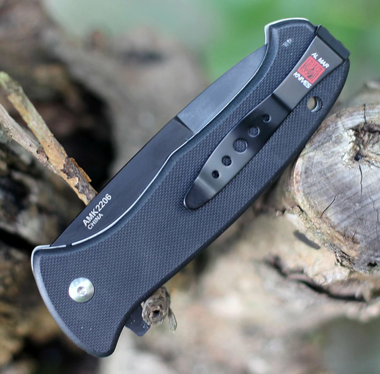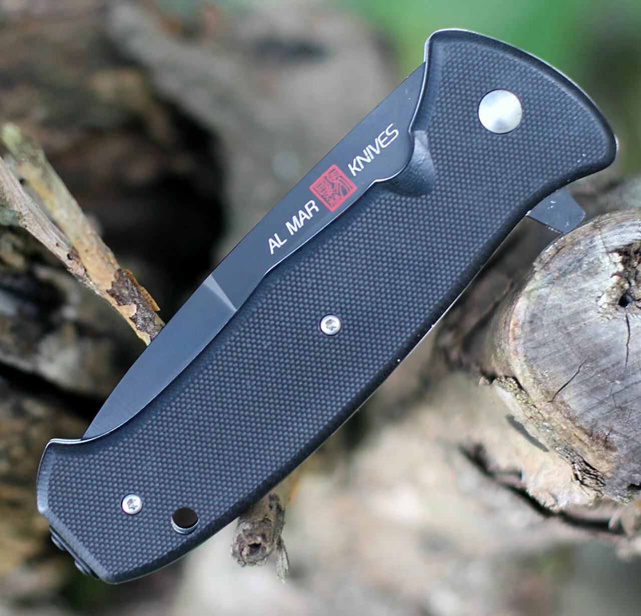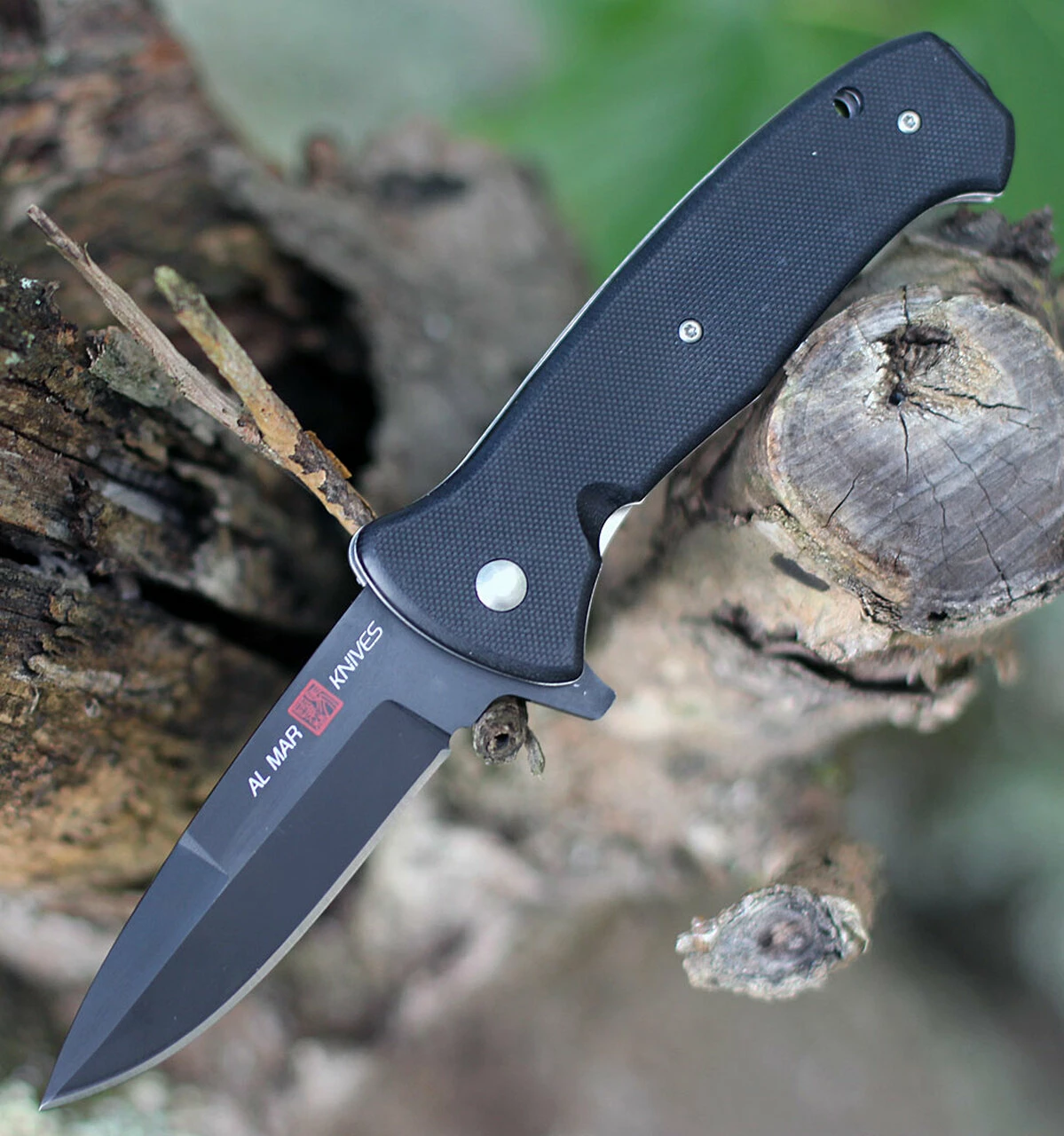 Al Mar S.E.R.E. 2020 Night Linerlock A/O 2206, 3.6″ D2 Matte Black Titanium Plain Blade, G-10 Handle