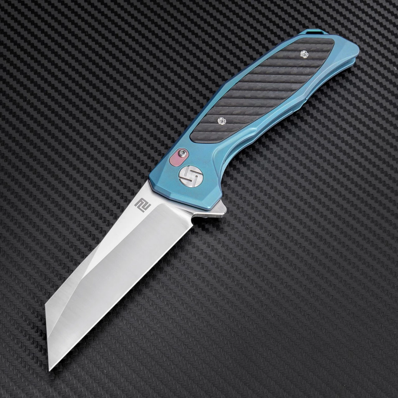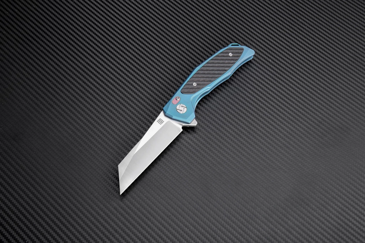 Artisan Falcon ATZ1809GBUS, 3.62″ S35VN Plain Blade, Blue Carbon Fiber/Titanium Handle