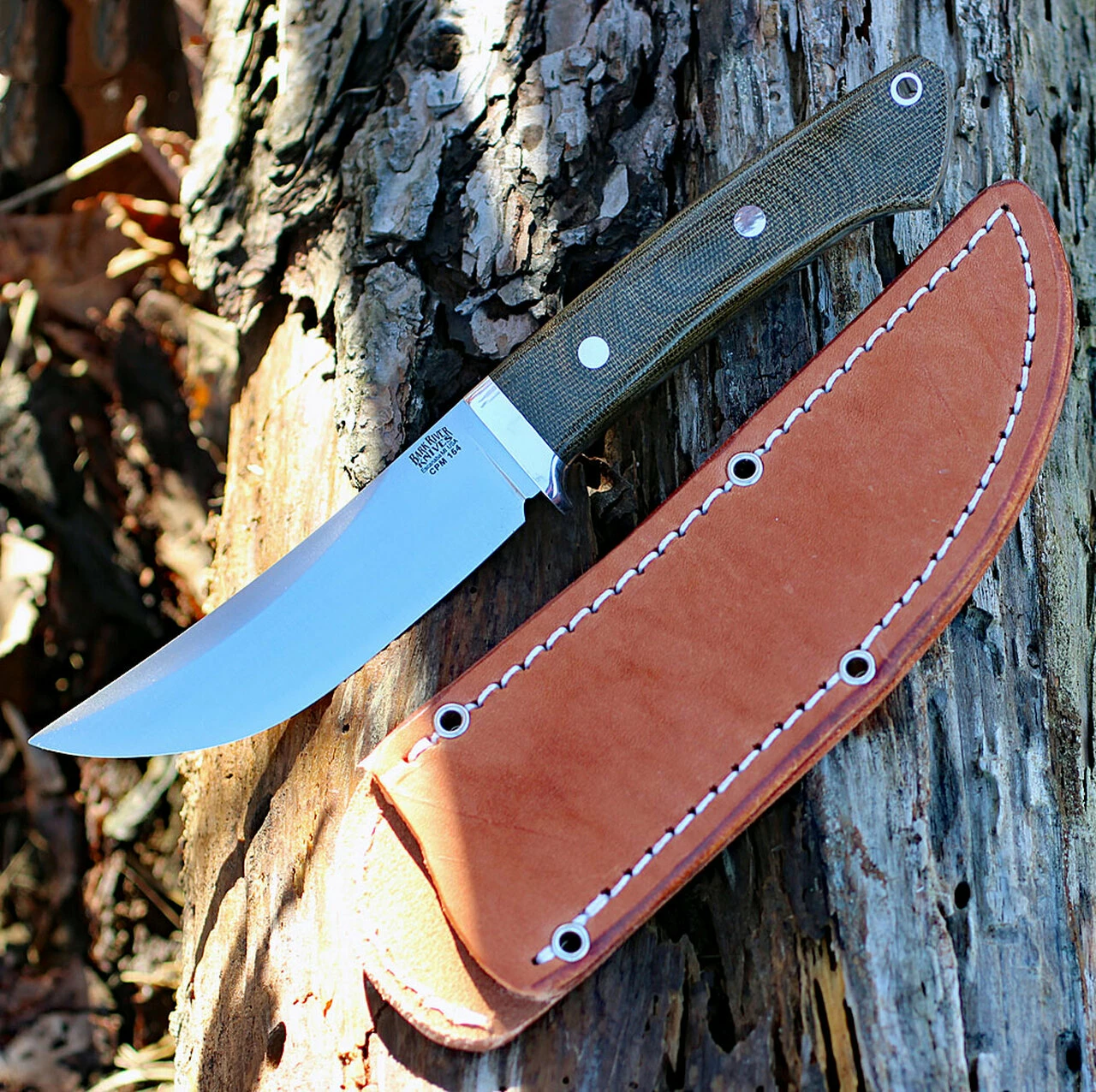 The new Bark River Trailing Point Hunter has the best features of the Classic Drop Point handle and our traditional trailing point blade. We made the blade a bit wider and longer than the drop hunter blade to maximize the slicing and skinning power of the knife. There is plenty of straight edge from the plunge line to do camp/bushcrafting and food prep chores. The knife is only 4.7 ounces so it is easy to carry on the belt or pack in your kit. The swedge grind thins the point for fine work. We think that this will be the ultimate upswept design for everyone that prefers this style blade.