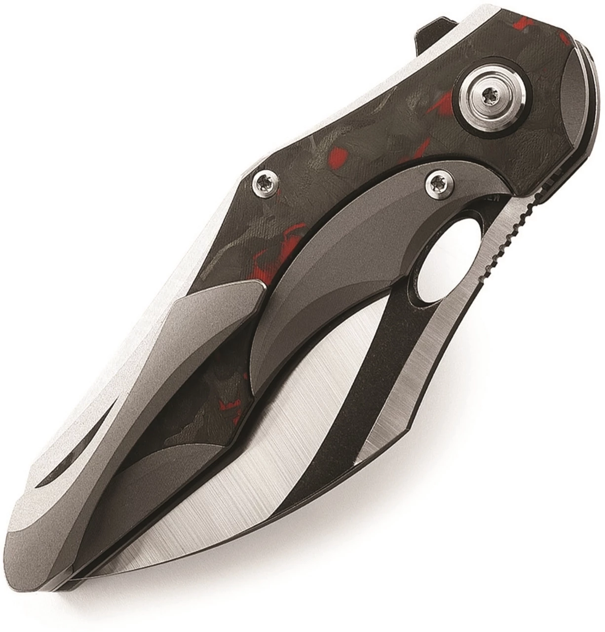 The Bestech Nogard challenges the very essence of what a knife should look like. Its unique, angular design distinguishes it from the hundreds of knives that share its materials. Satin and stonewashed Wharncliffe blade made of Bohler M390 steel. Ambidextrous thumb hole and flipper openers on ball bearing pivot. Red carbon fiber handle over gray titanium frame.