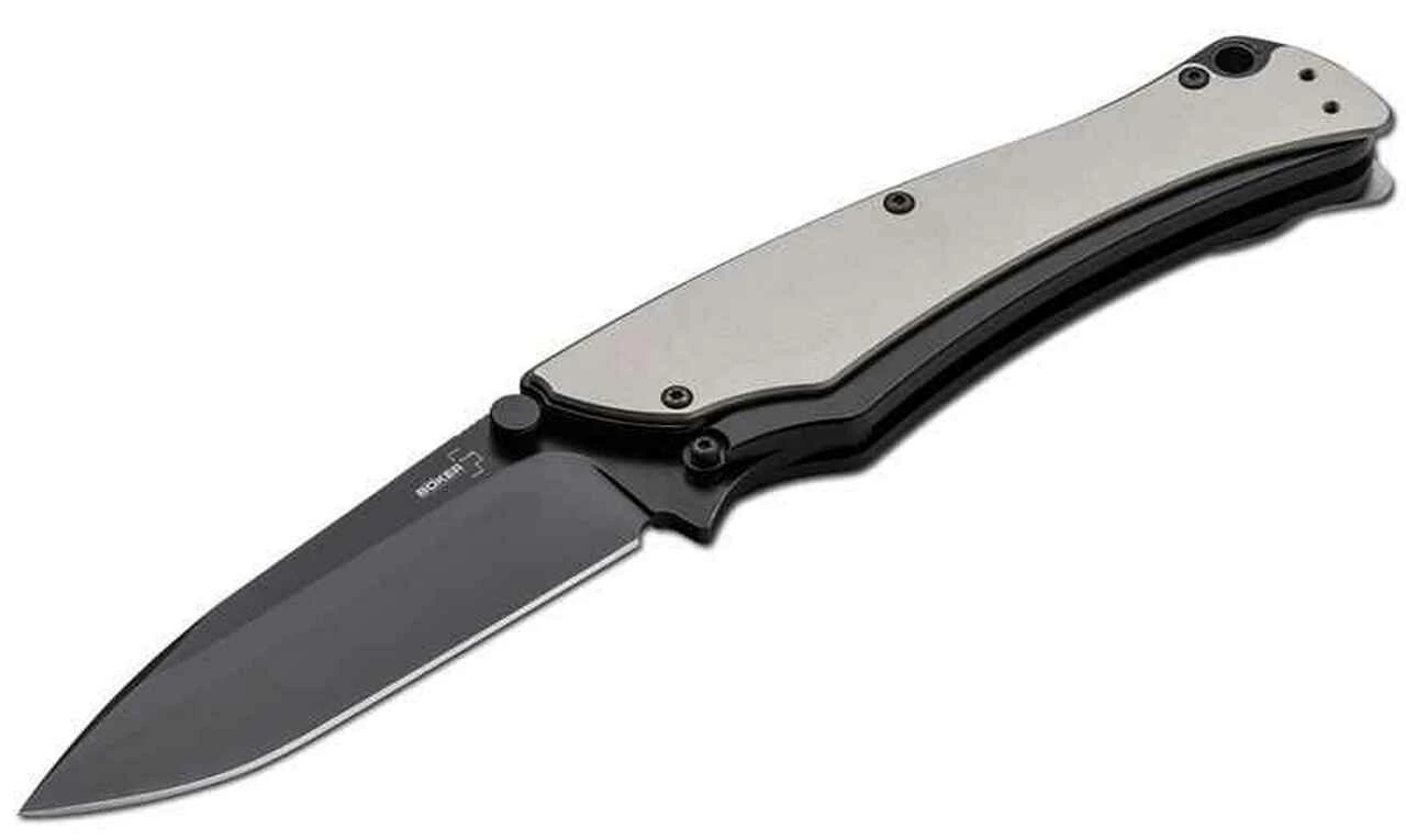 Boker Plus Griploc, 3 1/2 Black Coated AUS-8 Blade, Silver Aluminum Handles