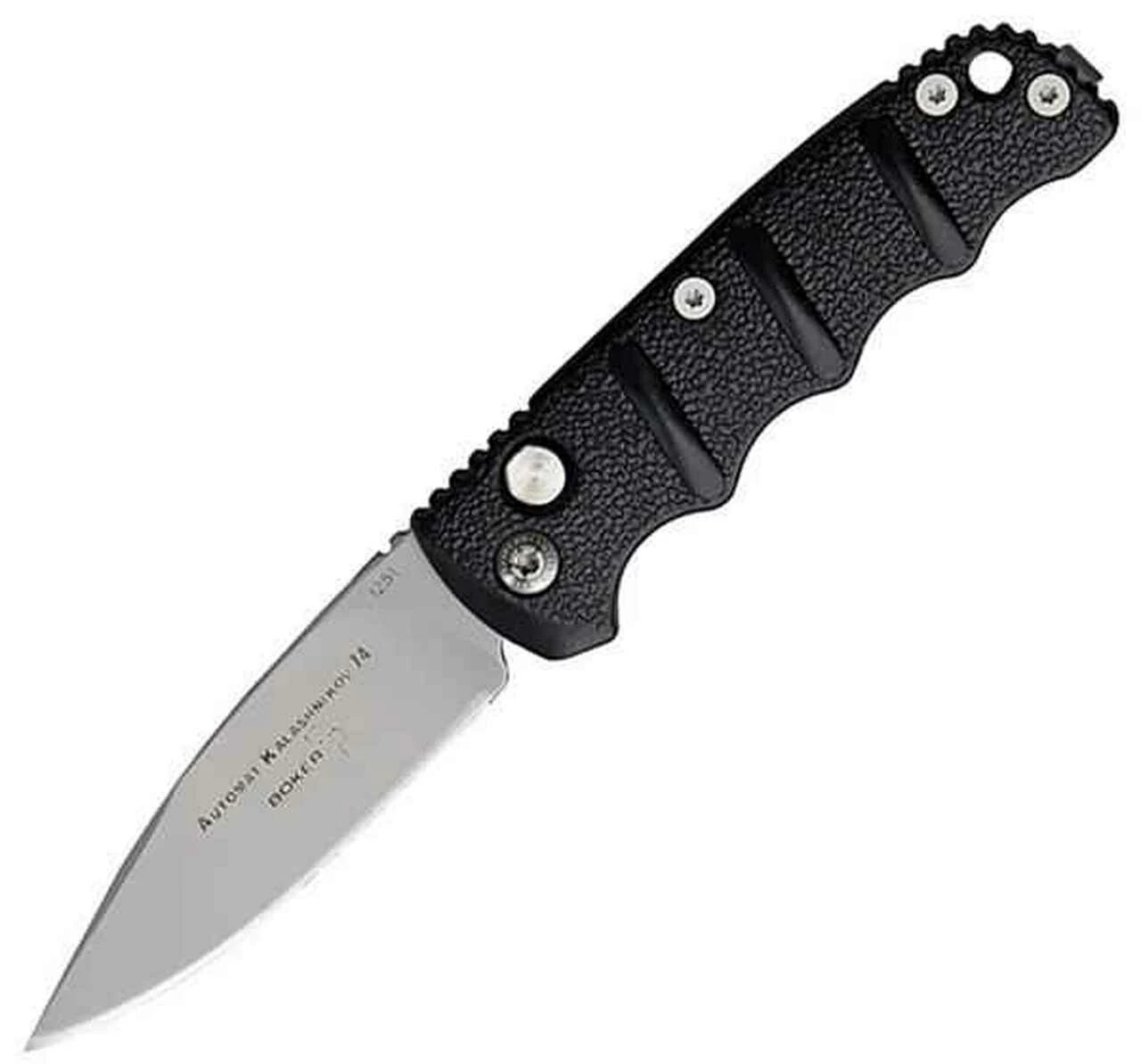 The answer to the call for a more compact version of our popular Kalashnikov button lock (non-automatic). Bead blast finish AUS-8 stainless blade with thumb ridge. Black fingergrooved Fiberglass reinforced nylon handles. Lanyard hole. Stainless pocket clip.
