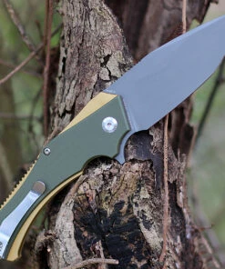 Kansept Knives KT1008A2 Hellx, 3.60″ D2 Stonewashed Blade, OD Green G10/Bronze Anodized SS Handle