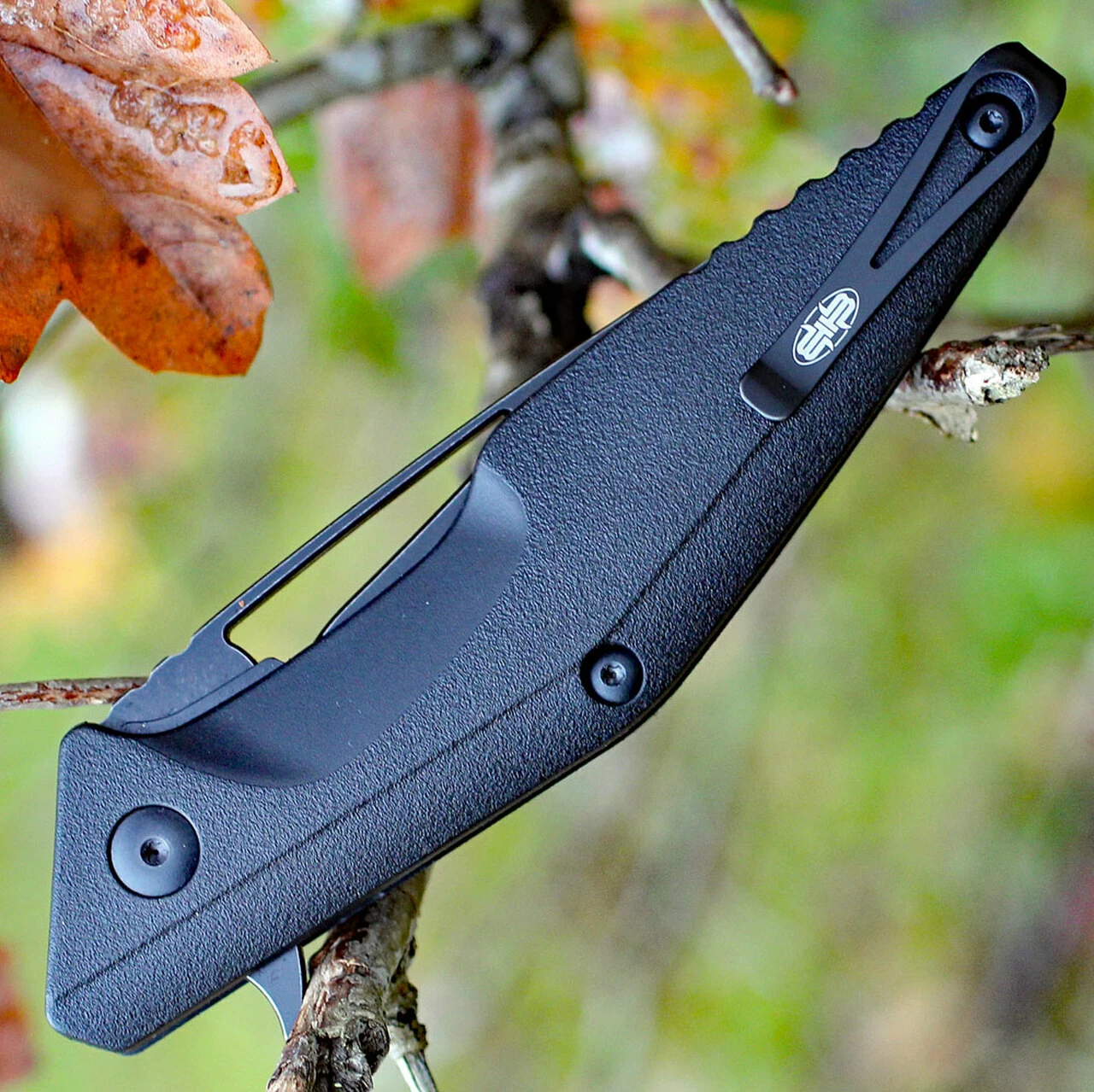Brous Blades Division Linerlock, 4.5″ Acid Stonewash Plain Blade, Black Polymer Handle
