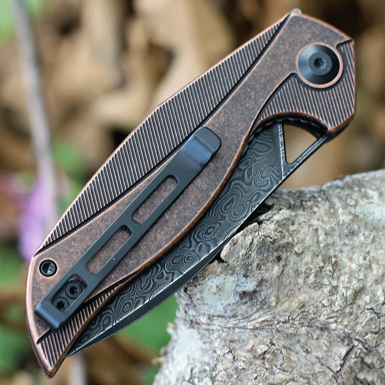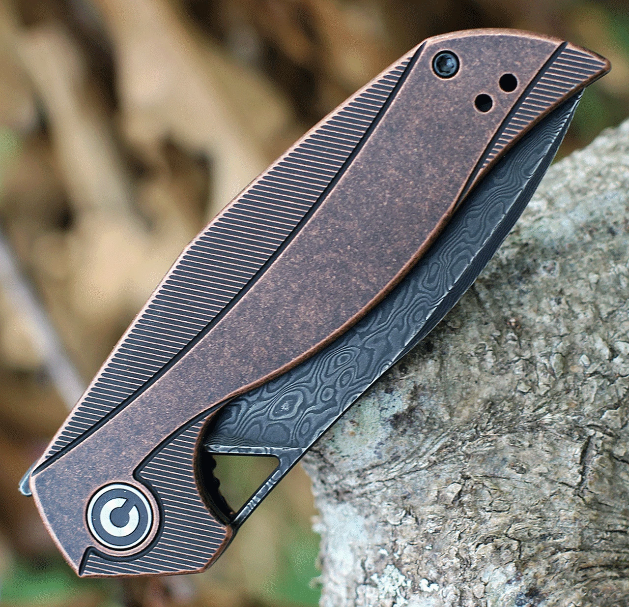 This model of the CIVIVI Anthropos comes with a black damascus steel blade. The handle is comprised of black copper.