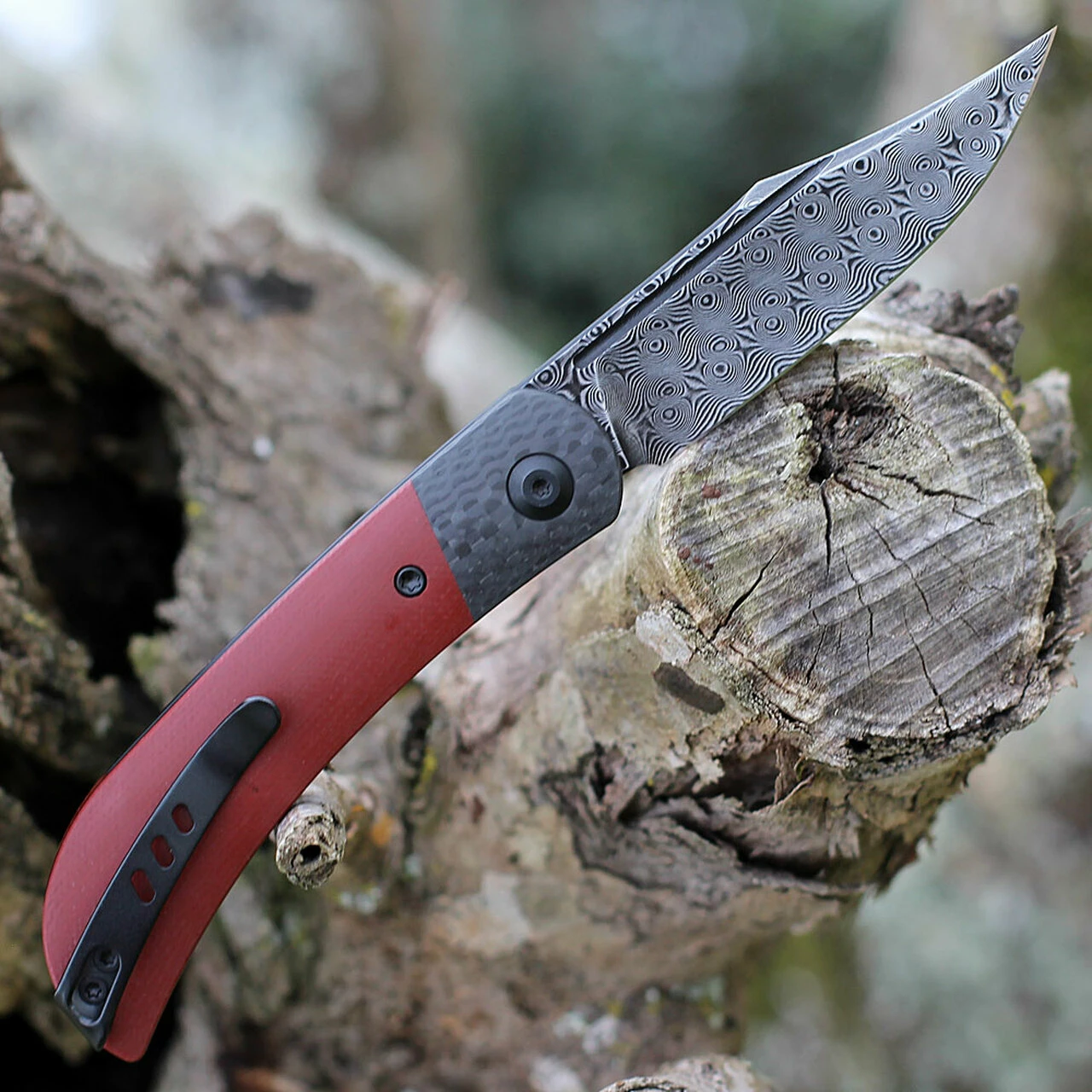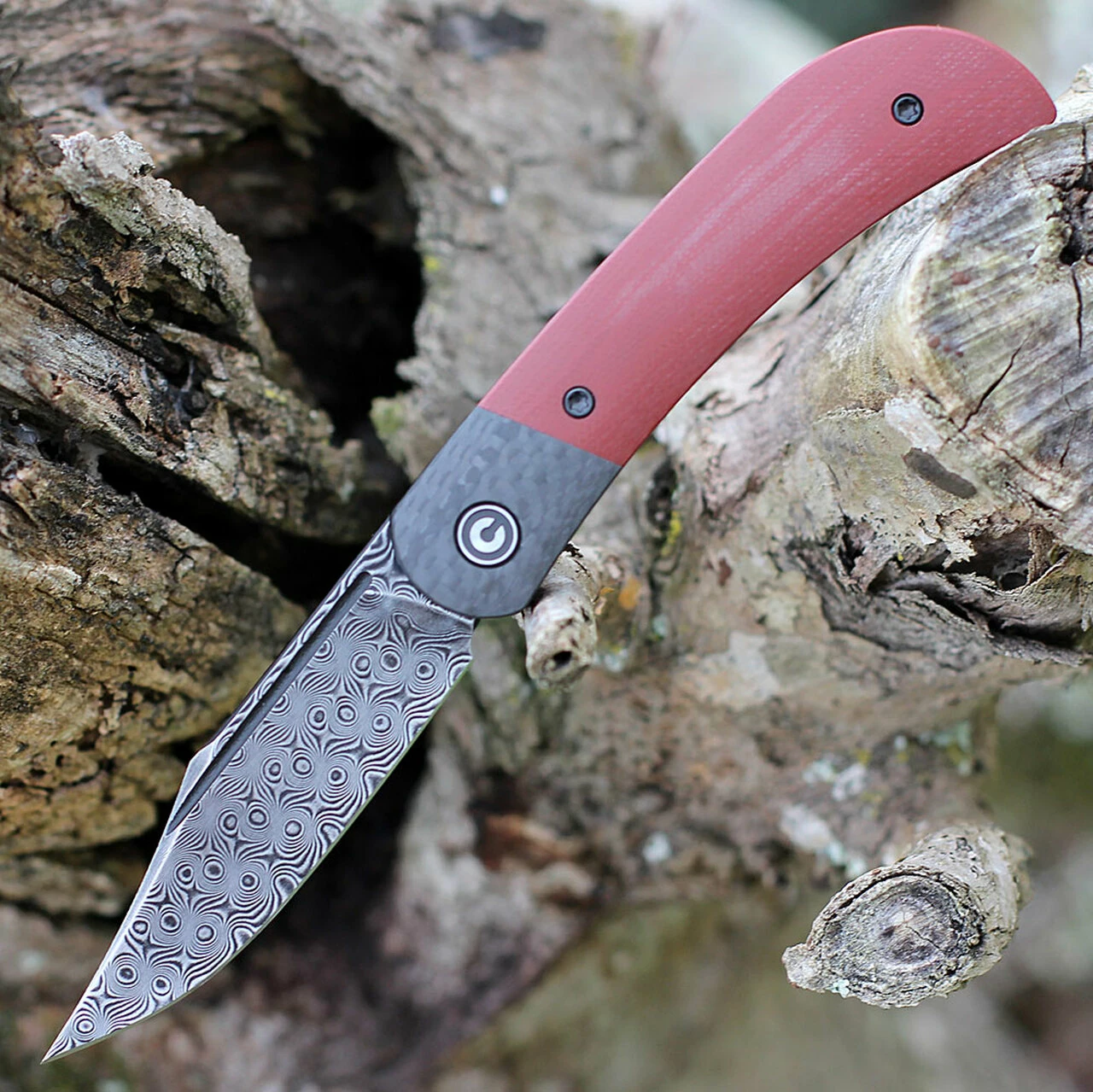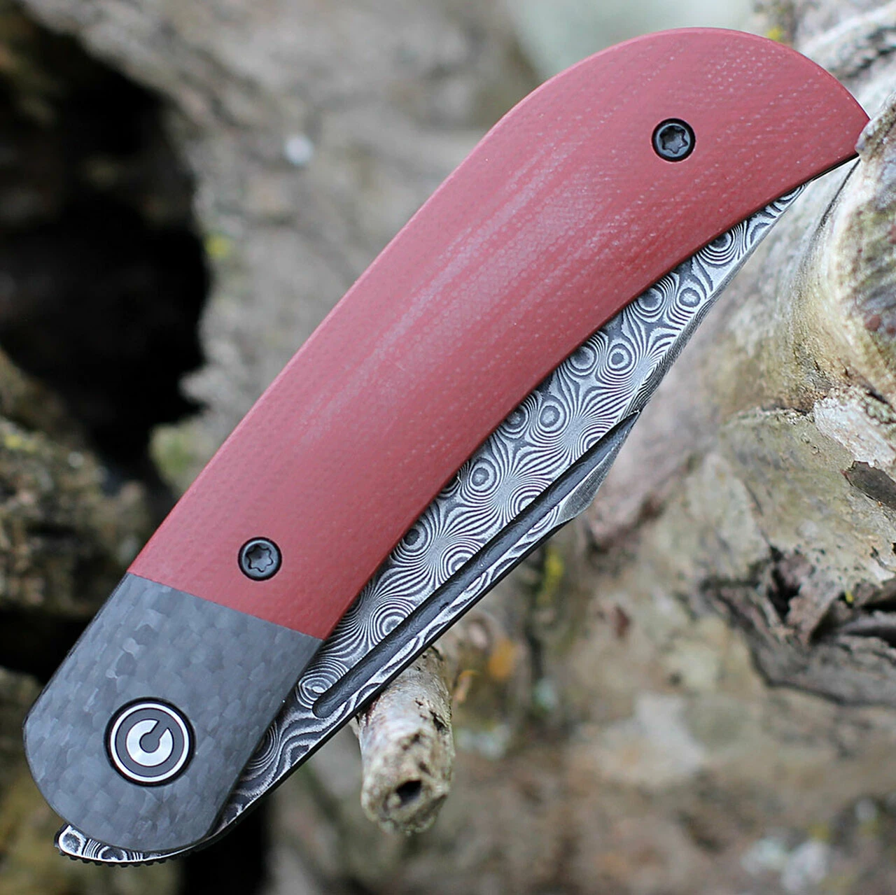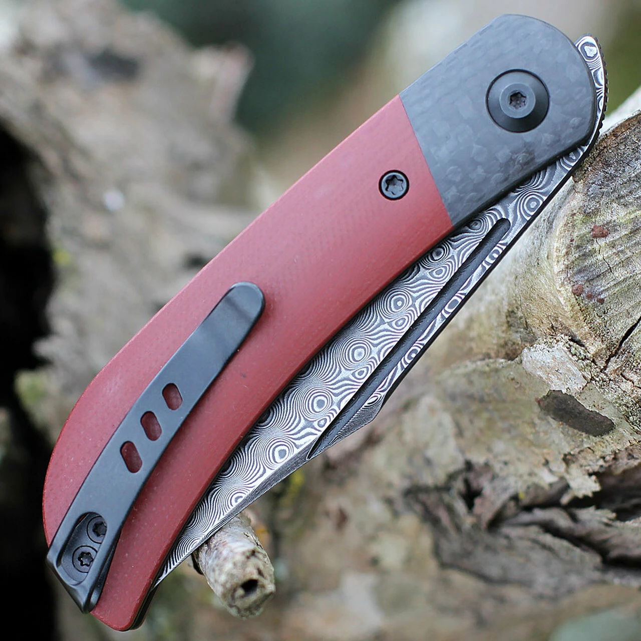 CIVIVI Appalachian Drifter II Front Flipper (C19010C-DS4) – 2.96″ Black Hand Rubbed Damascus Blade, Burgundy G10 Handle with Twill Carbon Fiber Bolster