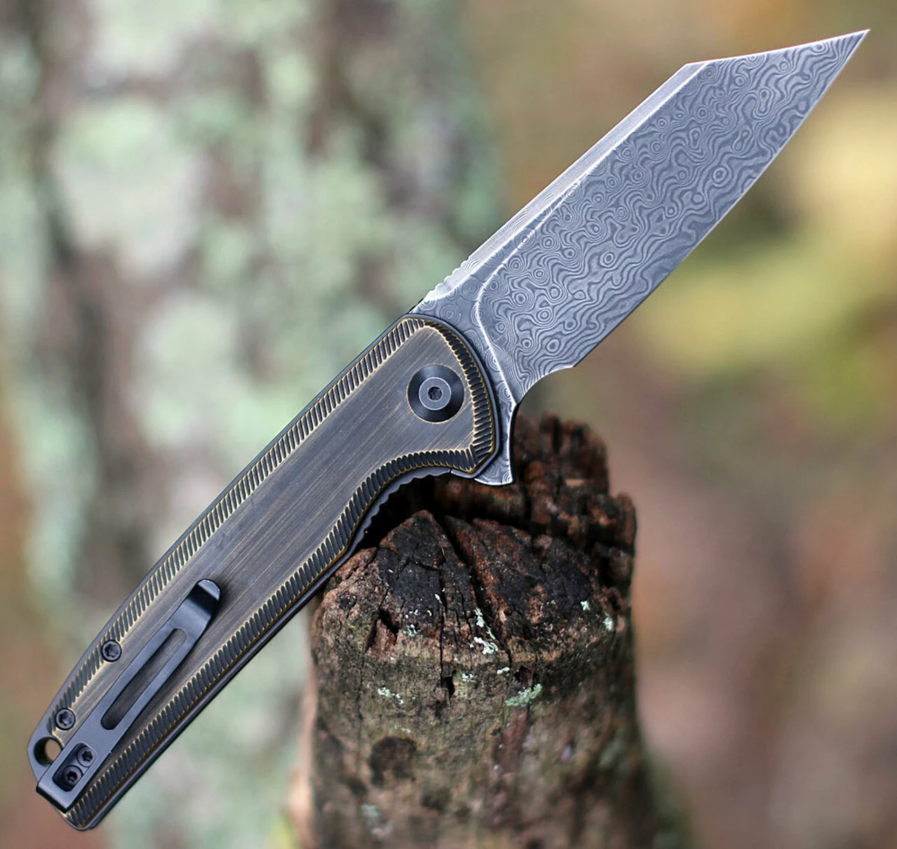 Civivi Brigand Linerlock Folder C909DS-2, 3.46” Damascus Wharncliffe Plain Blade, Brass Handle