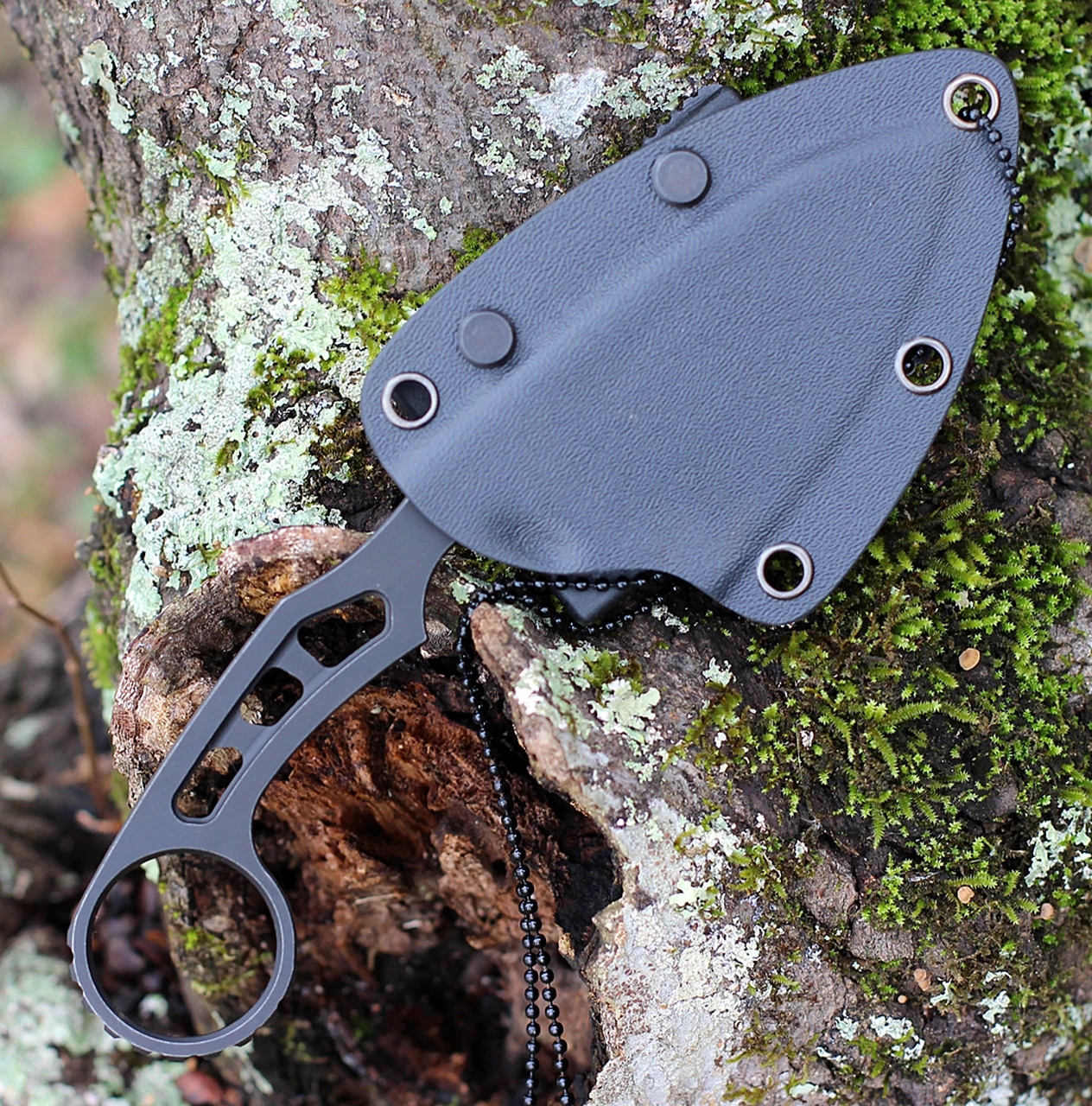 The Planck from Maciej Torbe is an interesting design combining EDC utility and tactical karambit functionality into one. And by interesting, we mean it’s a piece that we really enjoy and are sure you will too – especially if your hand size lines up with that of this design. Even if it doesn’t the Planck has a plan C for that in the form of the optional pinky ring. It’s large enough for use with gloved hands and it really shines in the reverse grip with your index finger through the hole. You then jab and punch at your assailant for safe yet effective CQC. The addition of the modified sheepsfoot blade makes it much more useful day to day and actually quite effective as a utility chopper/slicer. It includes a Kydex sheath with stainless steel neck chain and Terzuola T-Clip so you can carry it exactly how you want it. Skeletonized knives have never looked so menacing.