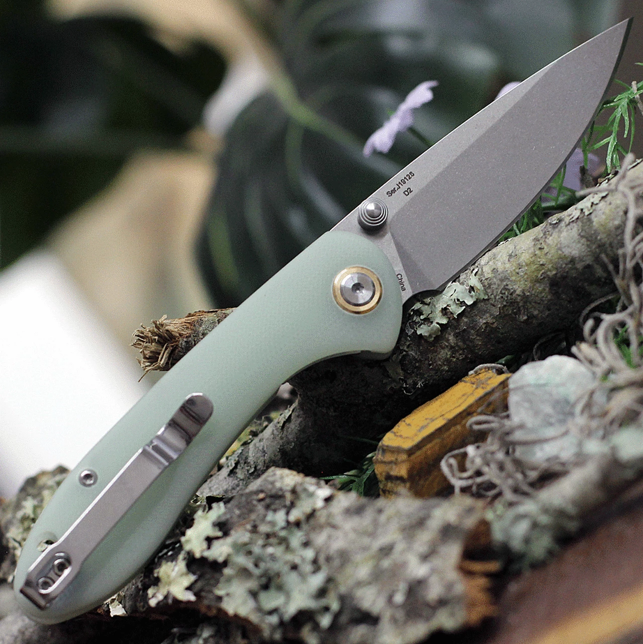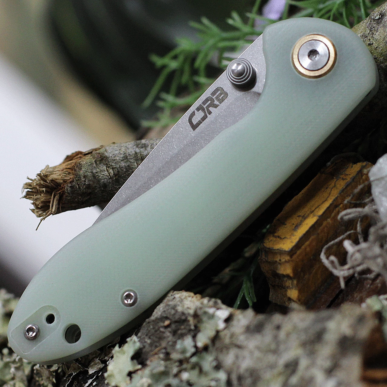 CJRB Cutlery Small Feldspar J1912S-NTG, 3.0″ D2 Steel Stonewashed Plain Blade, Contoured Natural G-10 Handle