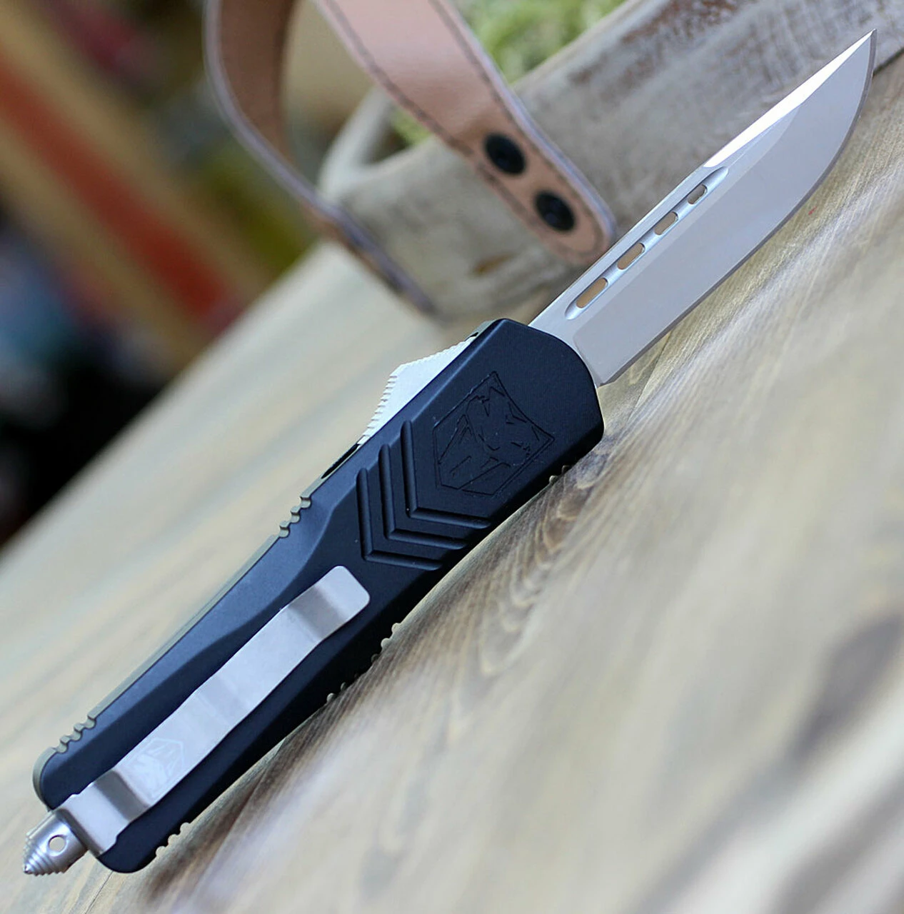 This CNC Machined OTF knife is very sleek and fits nicely in your pocket. The handle is expertly engineered from Aviation Aluminum and features a D2 Steel blade. The knife is ambidextrous as the pocket clip can be switched to either side of the handle depending on your preference