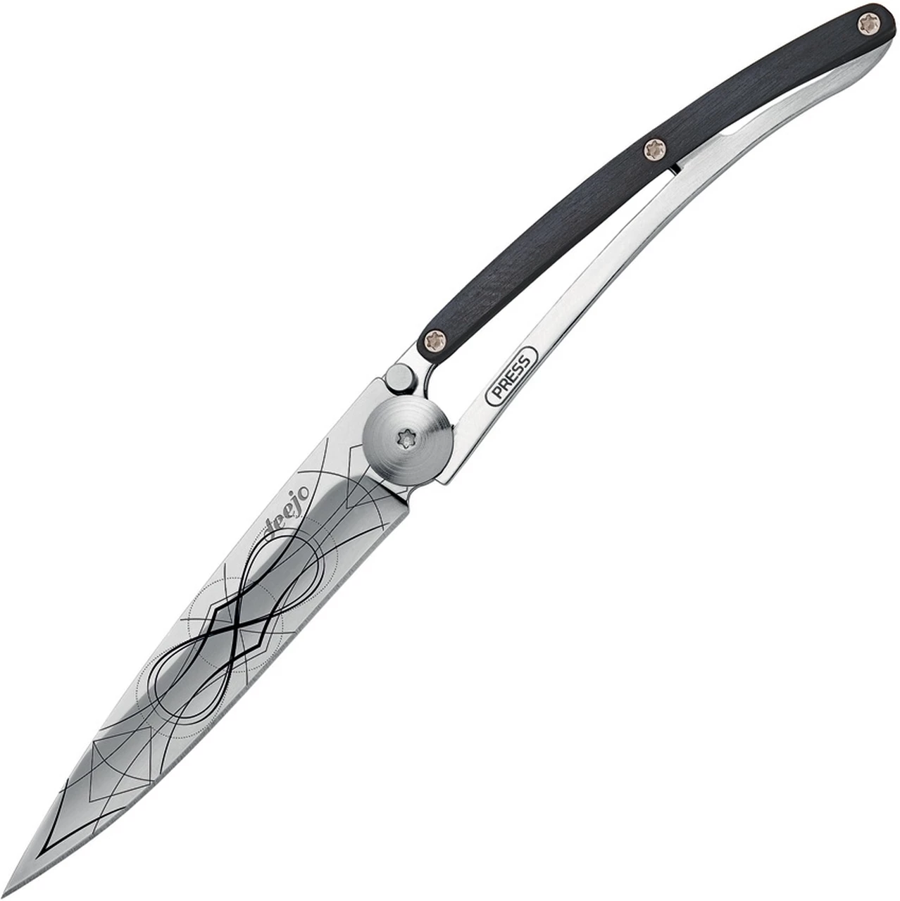 Ultra-light knife in Z40C13 stainless steel, Infinity Blade tatto . Secure liner lock system. Belt clip. Solid ebony wood handle slab.Ebony wood, visually appreciated for its deep blacks, possesses the particularity of being virtually insensitive to humidity. This species of wood is thus the densest, the most resistant, and the most precious, ideal for this magnificent piece of cutlery.