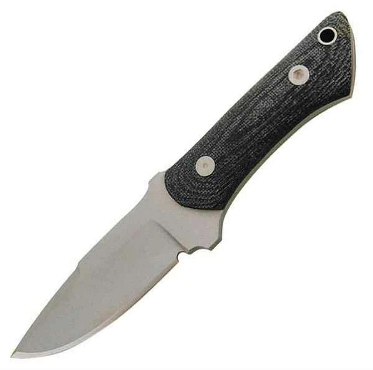 Entrek Lynx Neck Knife. 6 1/4″ overall . 2 5/8″ 440 stainless blade with bead blast finish. Full tang. Black canvas micarta handles with lanyard hole. Black Kydex belt sheath with neck lanyard. Made in USA with materials from US companies.