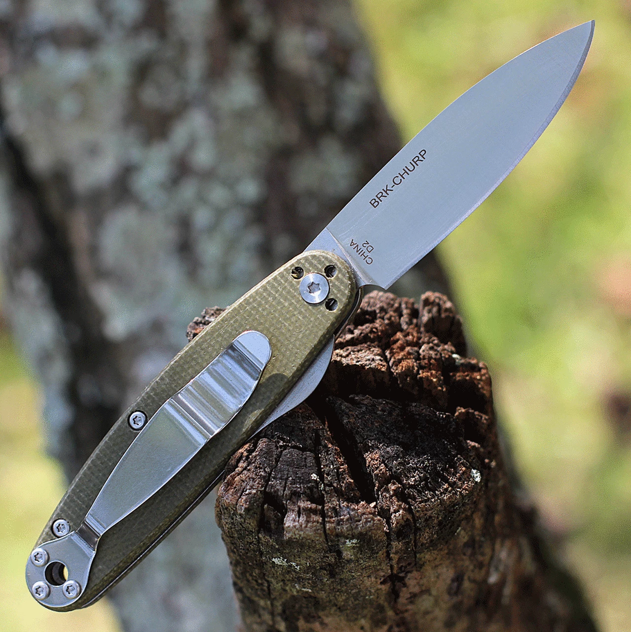 BRK Churp by ESEE – Liner Lock Folding Knife – 2.7″ D2 Satin Drop Point Plain Blade, Olive Green Micarta Handle