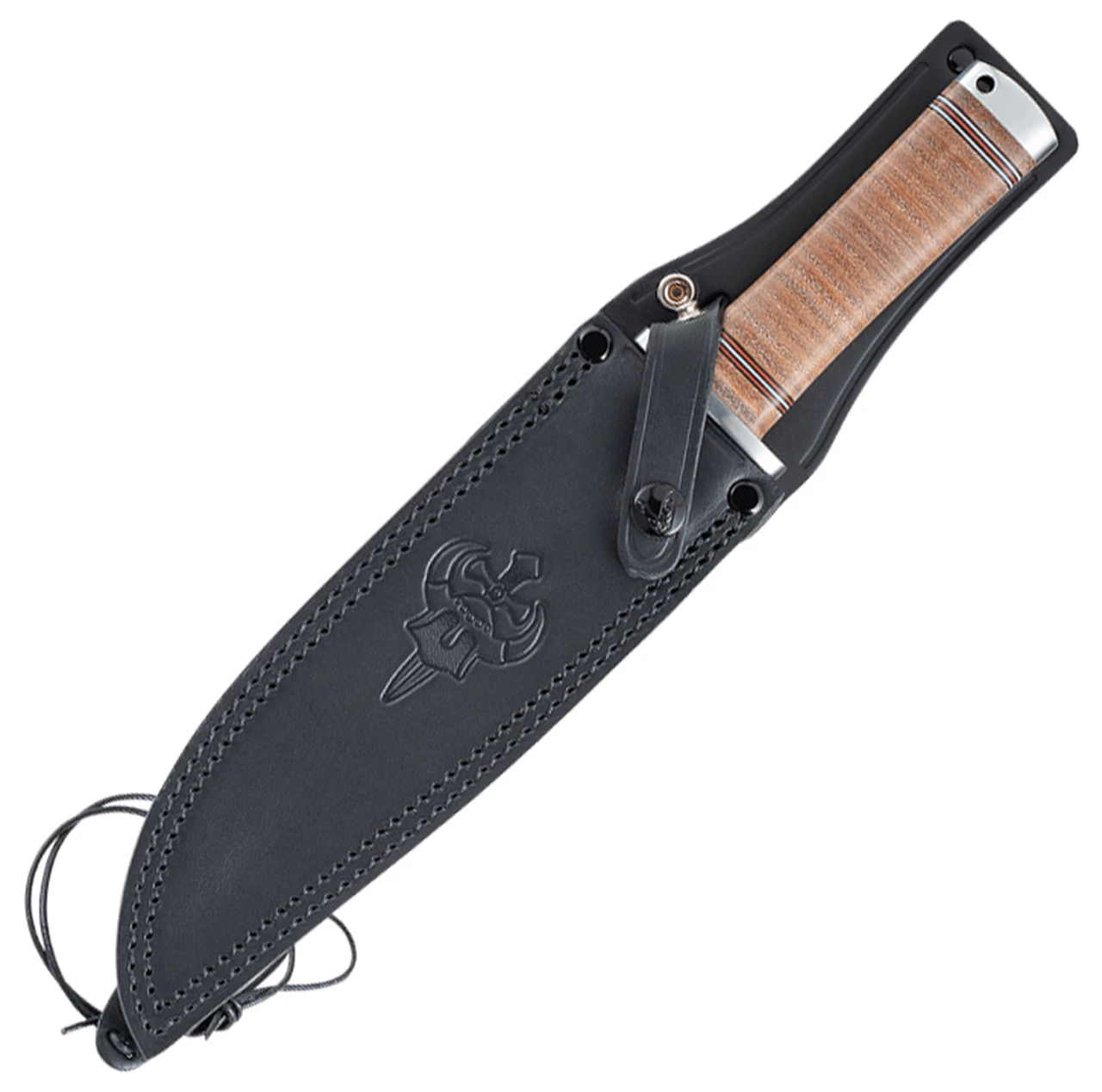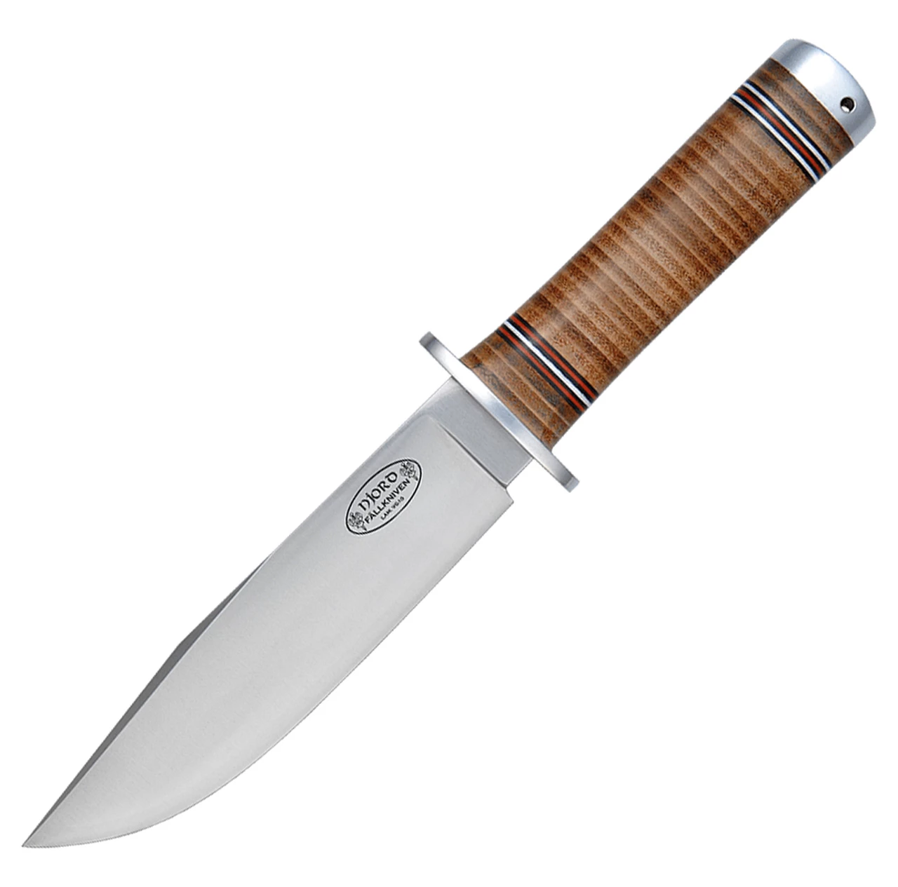 Fallkniven NL3L Njord Northern Light, 5.9″ Satin VG10 + 420J2 Plain Blade, Stacked Leather Handle with Black Leather Sheath