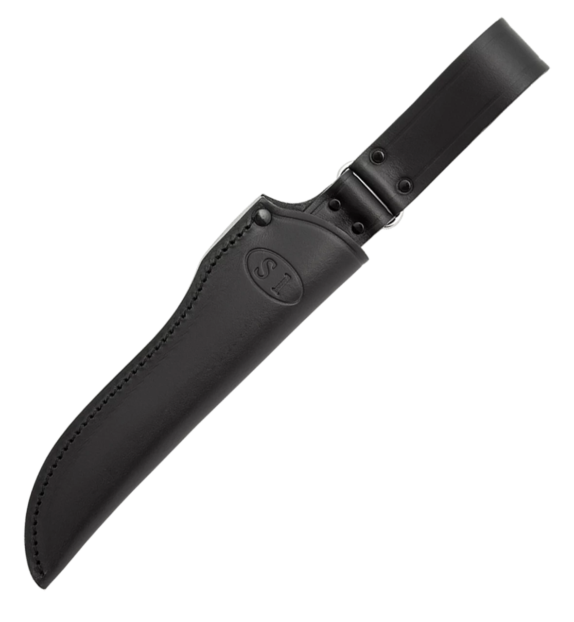 The Forest Knife is probably the best hunting and fishing knife ever made. Its sturdy blade made of the new extremely strong stainless Black Teflon coated VG-10 custom steel is convex grounded for extra strong cutting power with no risk for edge breakage. The modified clip point design works well for penetrating purposes the long curved edge is ideal for skinning. The blade is long enough for lighter chopping and won’t break it’s full 5 mm (0.2″) thick. The checkered Thermorun handle gives a good grip even when hands are cold or wet. Top grain leather sheath.