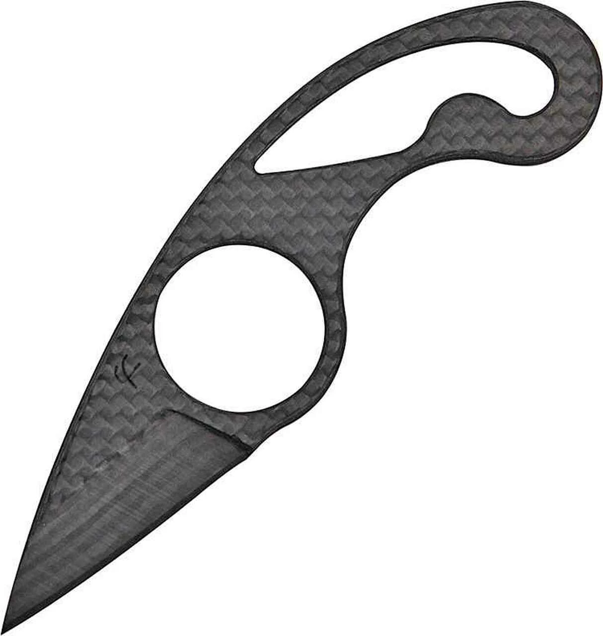 4 7/8″ overall. 1 3/4″ drop point blade. One-piece black carbon fiber construction with integrated finger ring. Skeletonized handle. Molded black Kydex sheath with black beaded stainless neck chain.