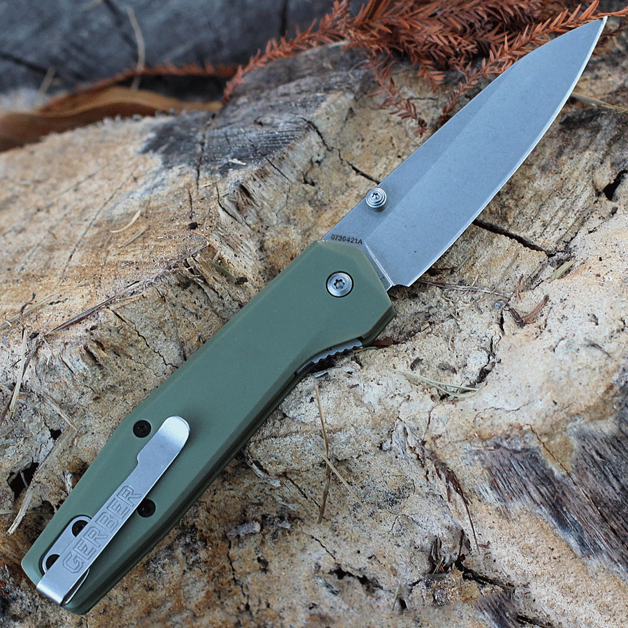 Gerber Fuse Folding Knife (30-001875) 3.75″ 7Cr Stonewashed Drop Point Blade, Flat Sage (OD Green) GFN Handle