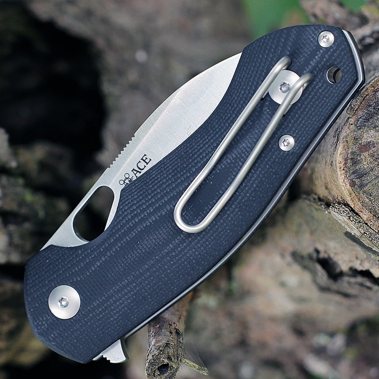 This GiantMouse Ace Grand is made with bohler M390 stainless steel blade and a black G-10 handle. The ace grand features a 2.87″ satin drop point blade with a liner lock.