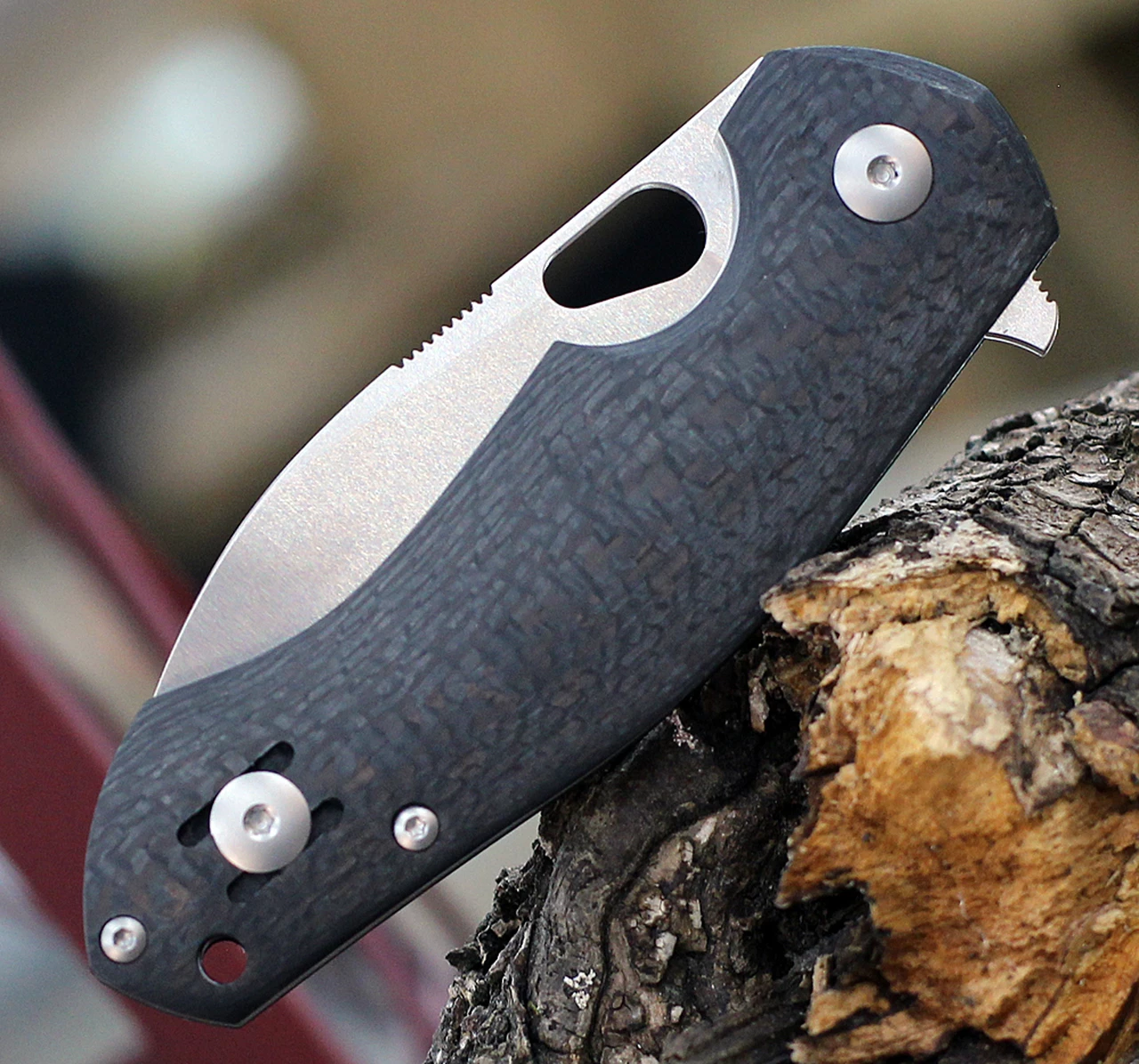 When using the Biblio you’ll quickly notice how well it performs. The handle fills even larger hands well, due to the nicely rounded scales and spot-on ergonomics. And the Carbon Fiber on these is simply beautiful! The nicely thin ground blade makes this knife a real slicer, and by choosing a flat saber blade grind and M390 steel to produce a strong blade with a fine cutting edge that you’ll enjoy using for years to come.