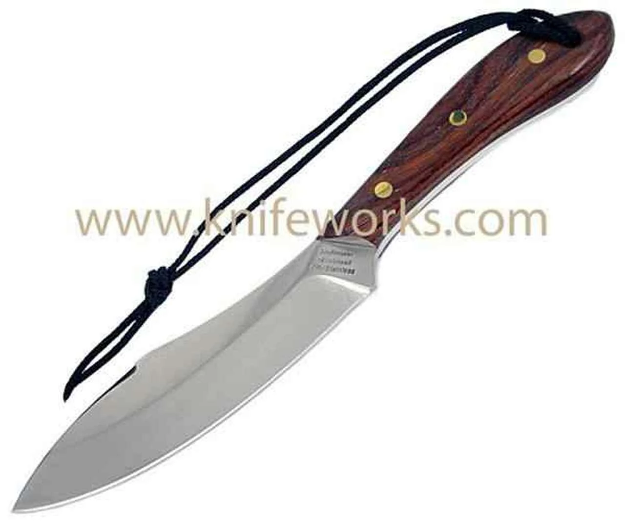 Grohmann Survival Knife. 10 1/4″ overall. 5 1/2″ stainless wide design elliptical blade with false edge. Rosewood handles. Full tang. Lanyard. Lock-down style leather belt sheath. Designed by D. H. Russell. Made in Nova Scotia.