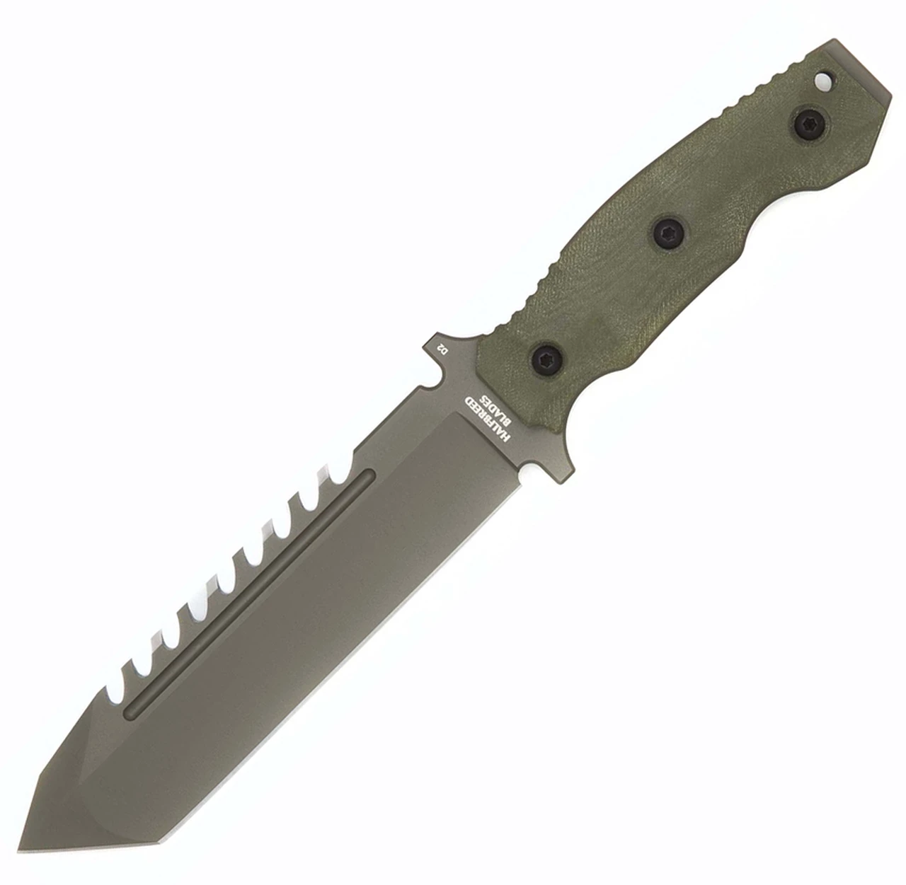 Halfbreed Blades Large Survival Knife (LSK-02OD) 6.89″ K110 (D2) Teflon Coated Tanto Point Sawback Blade, Ranger Green G-10 Handle