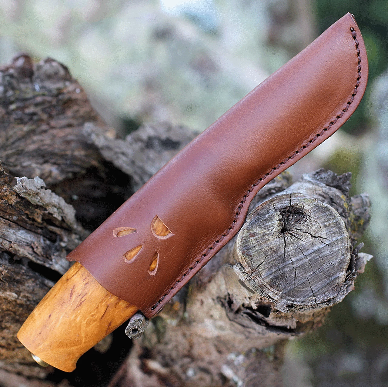 It has a blade made of non-laminated stainless steel (Sandvik 12C27). With its curly birch handle and a straight forward leather sheath this is an every mans knife for every day chores.