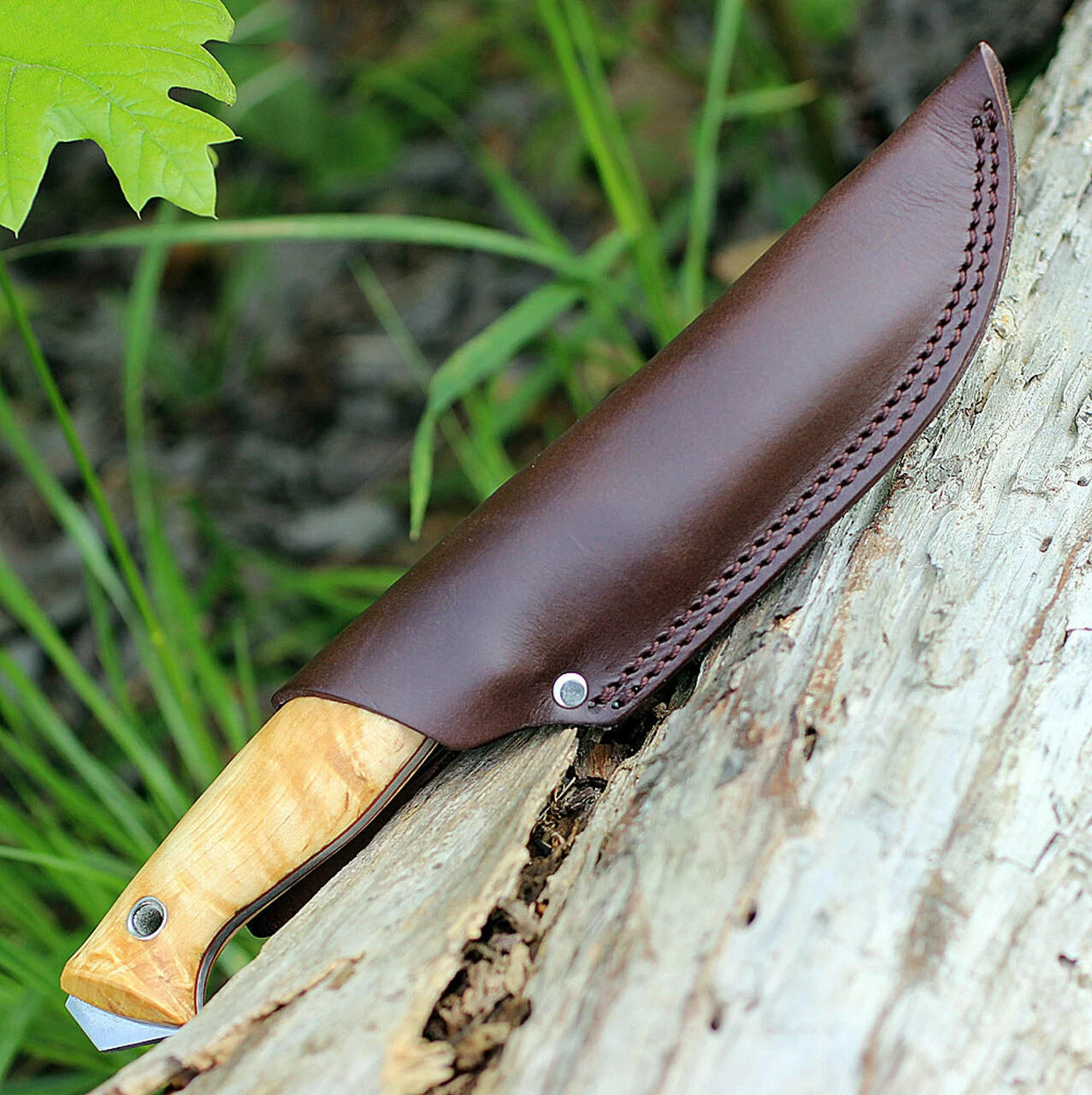 The Utvær featurs a strong, full tang construction, ample curly birch handle and 4-inch blade of Sandvik 12C27 steel. The drop point Scandinavian ground blade, leather sheath, and curly birch wood handle characterize Helle’s renowned strength, functionality and beauty.