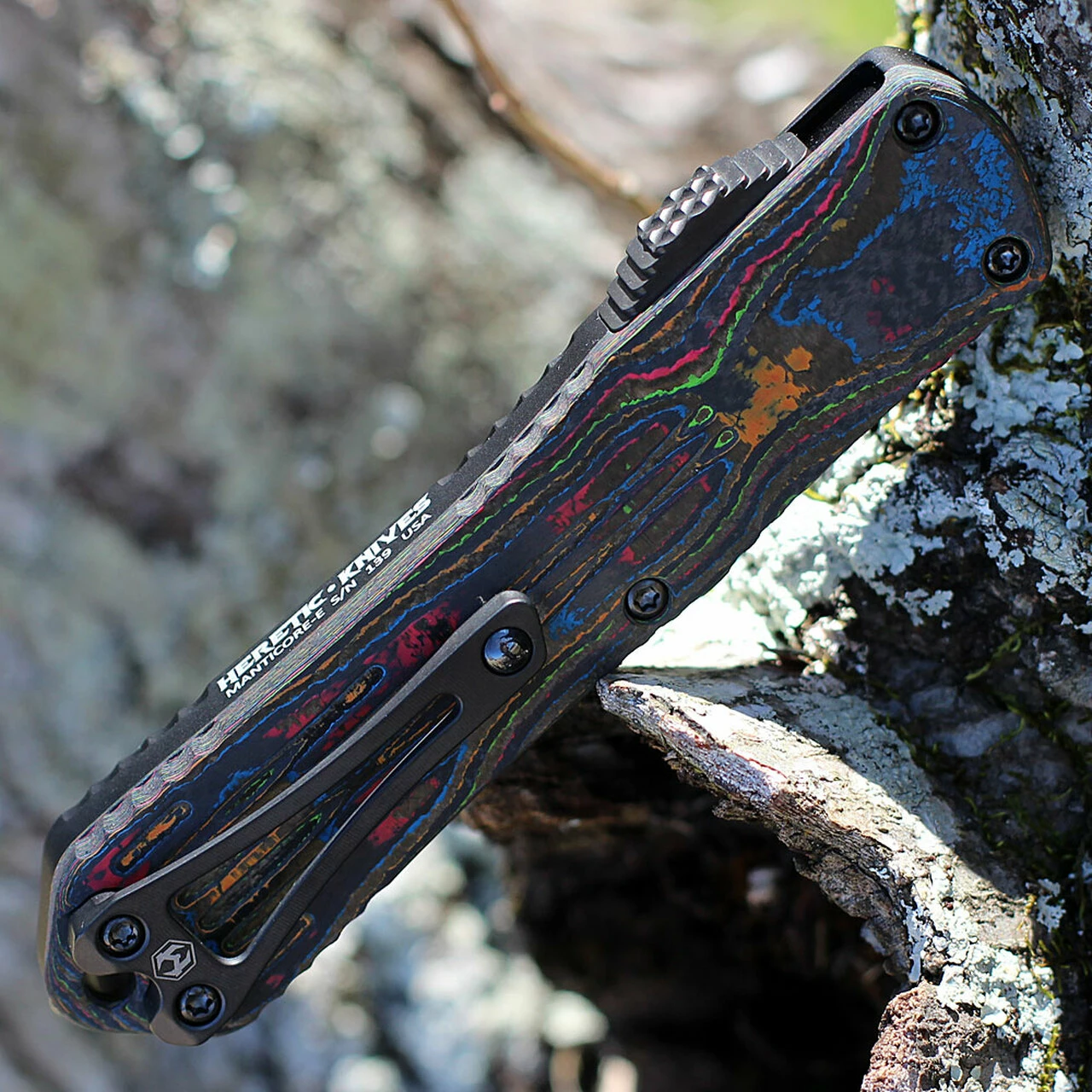 Heretic Manticore E OTF Automatic (H027-6A-CF80’s) – 3.19″ Elmax Black Stonewashed DLC Tanto Blade, Awesome 80’s Carbon Fiber Backcover and Black Aluminum Front Handle