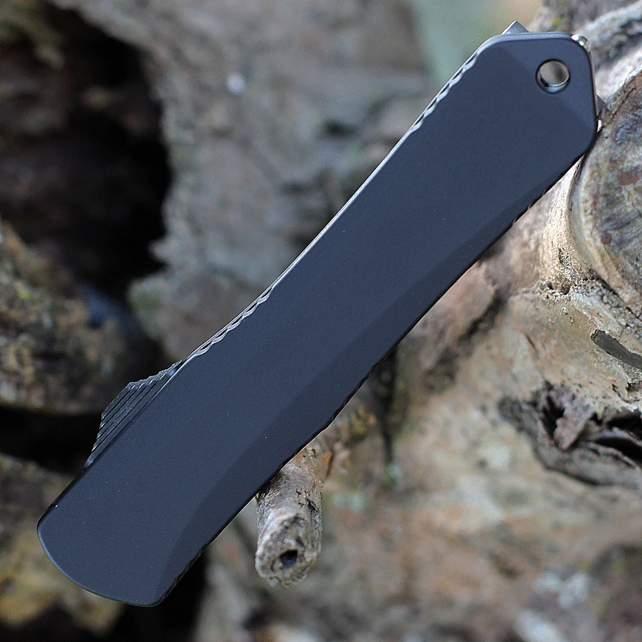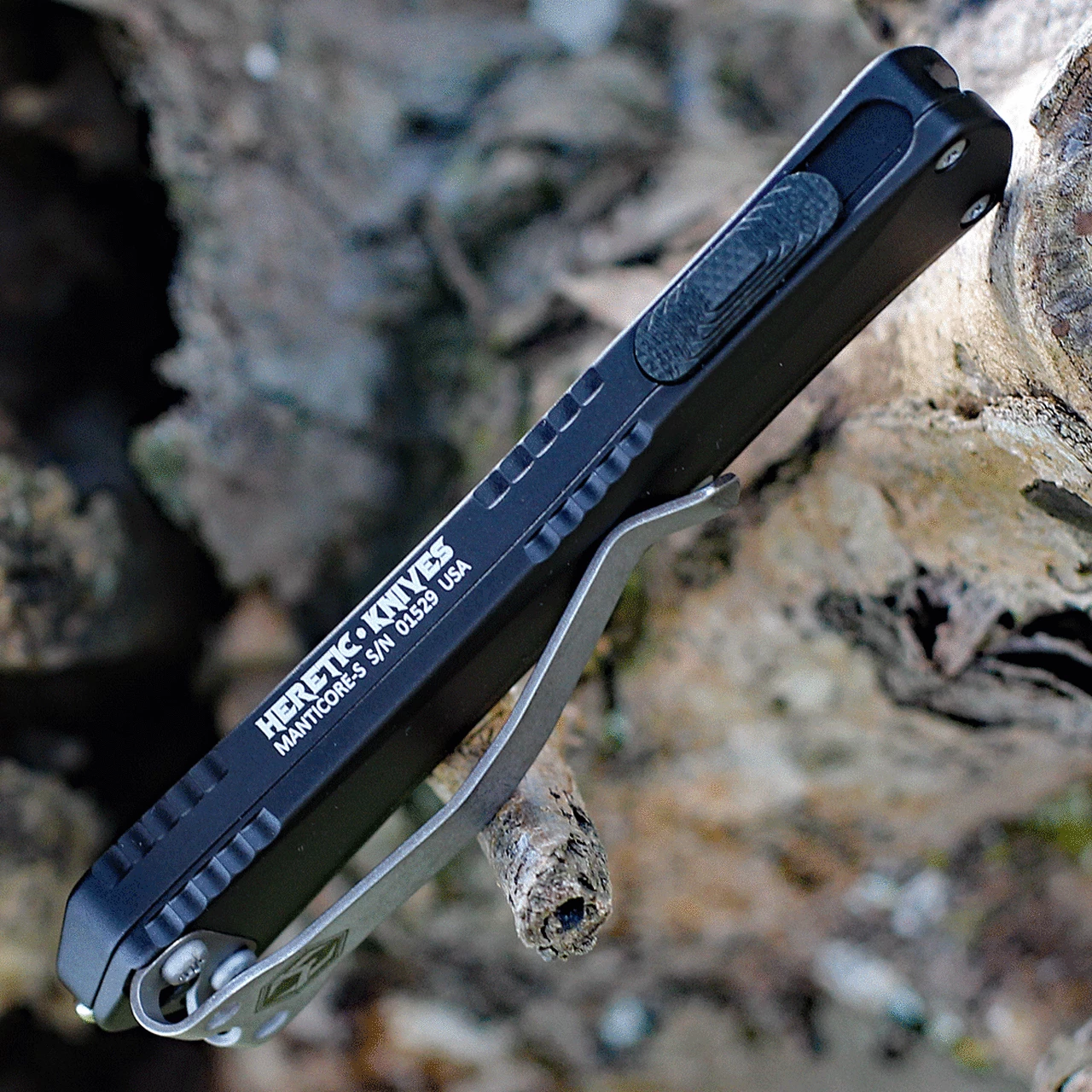 The Manticore S is a double action out-the-front, the blade can be deployed and retracted with one hand. The knife’s smooth action starts with a stepped thumb slide so you can fire the blade with confidence. Elegant sweeping lines and jimping down the length of the handle add depth to an otherwise smooth body. A hardened steel glass breaker rounds out the handle.