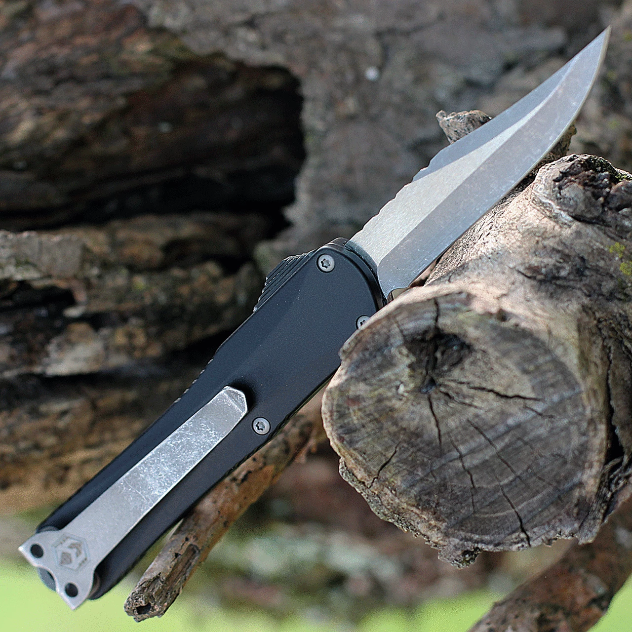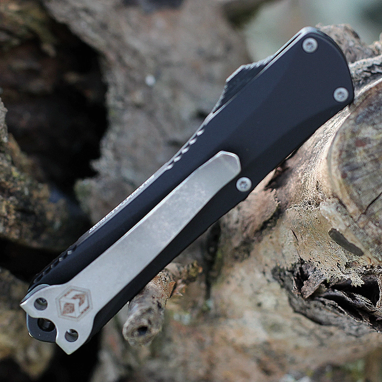 Heretic Manticore S OTF Auto HO22B-5A, 2.62″ Bowie Battleworn Persian Blade, Black Aluminum Handles