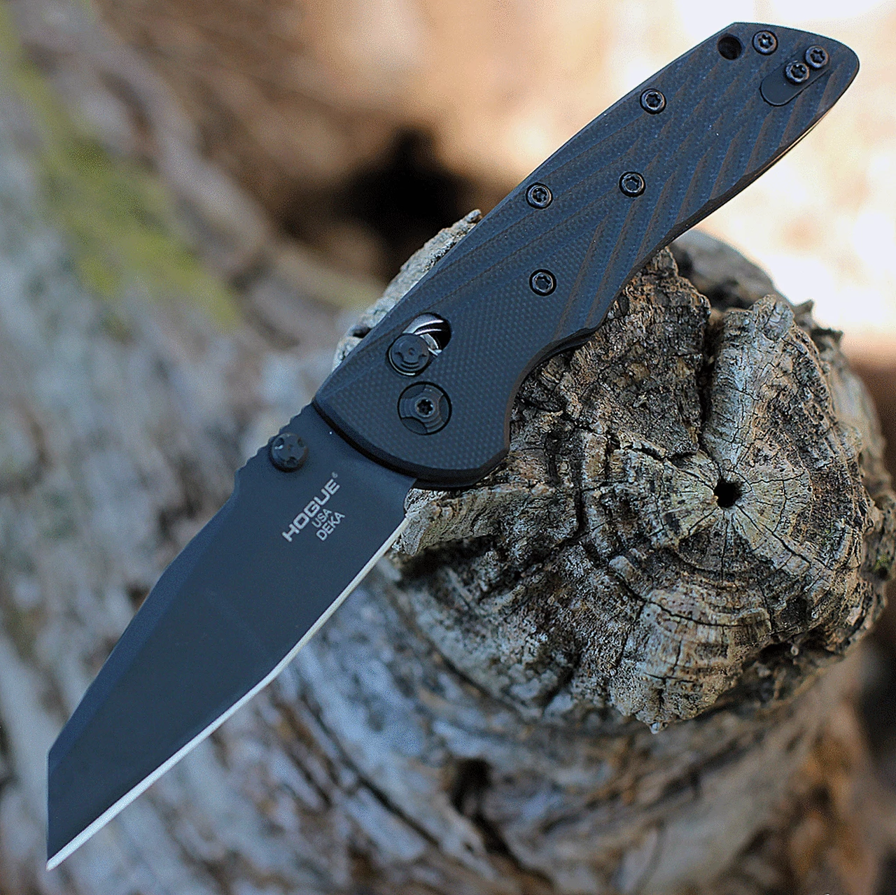 Hogue Deka ABLE Lock Folding Knife, 24266, 3.25″ CPM-20CV Black Cerakote Modified Wharncliffe Blade, Black G10 with Crosshatch Texture Handles