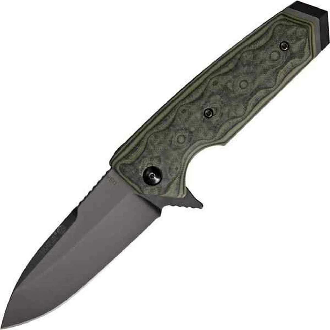 Hogue EX-02 Extreme Series Linerlock – 154CM stainless blade. Manual safety lock doubly secures knife in open position. G-Mascus G-10 handle scales. Integrated glass breaker pommel. Reversible stainless pocket clip. Elishewitz design. 4 1/2″ closed. 3 1/4″ black finish spear point blade with integral flipper. Green handles.