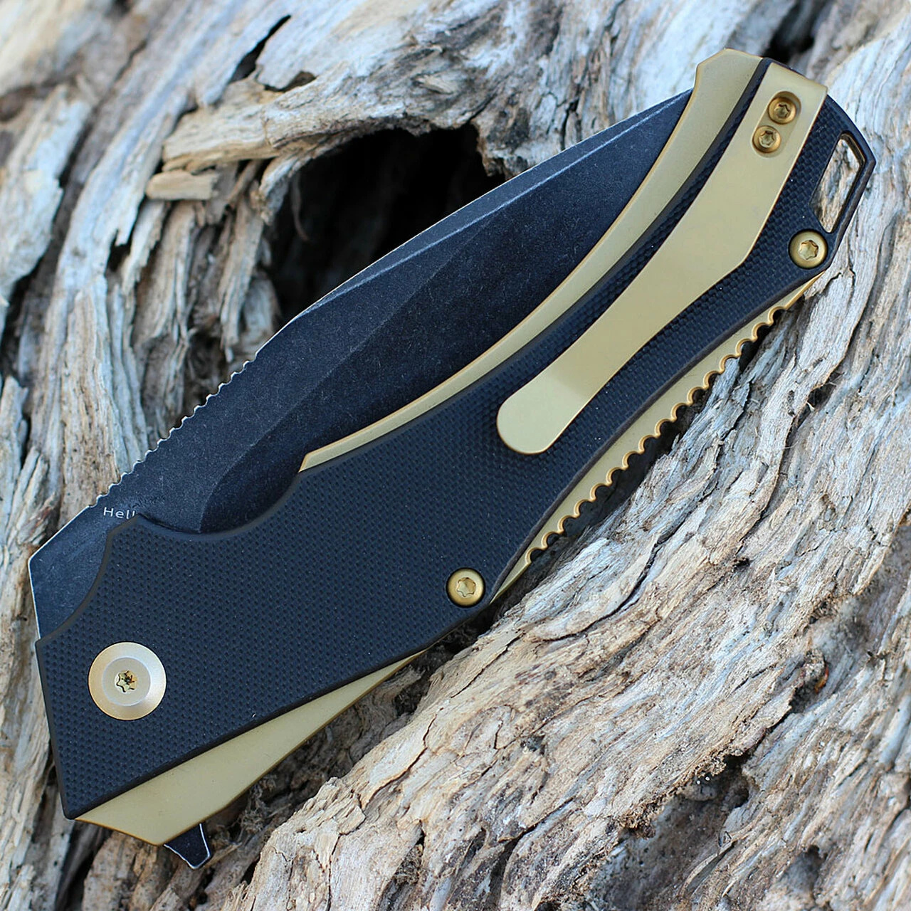 Kansept Hellx Folding Knife (T1008A7) – 3.6″ D2 Black Stonewashed Drop Point Blade, Black G10 Scales with Gold Stainless Steel Handle