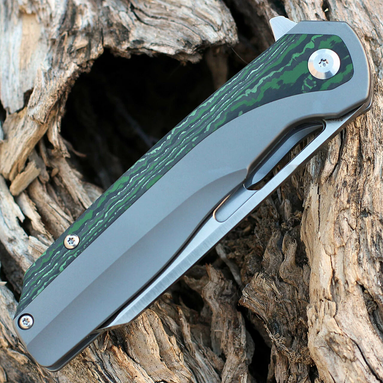 Kansept Shard Left Hand Flipper (K1006L6) – 3.48″ CPM-S35VN Satin Wharncliffe Blade, Gray Titanium Handle with Jungle Wear Carbon Fiber Inlay