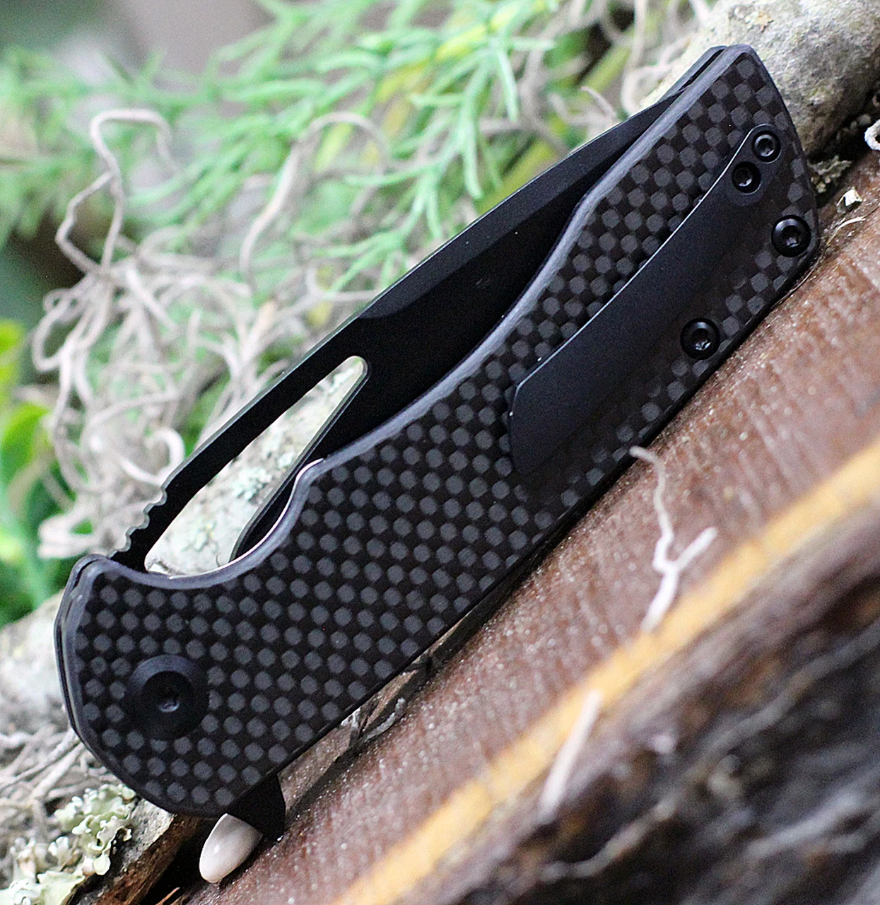Black carbon fiber handle for a smooth gripping surface that is comfortable in the pocket or hand.