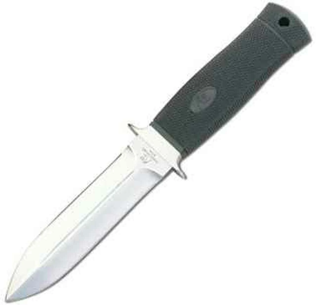 Katz Avenger Series Boot Model. 8 7/8″ overall. 4 3/8″ XT-70 stainless double edge beveled blade with blood groove. Black Kraton diamond checkered handle with slight palm swell. Stainless guard. Lanyard hole. Black Cordura clip sheath.
