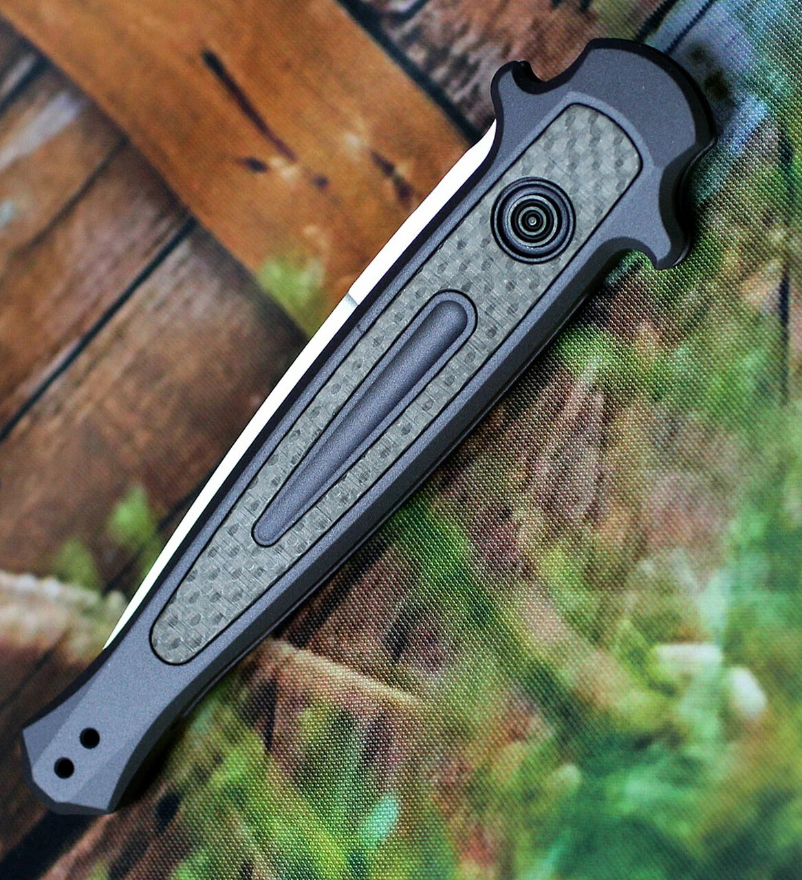 The Launch 8 features the sleek, symmetrical lines of a stiletto in a push-button knife that’s lightweight—only 2.4 ounces—and easy-to-carry. The blade is CPM 154 with a stonewashed finish. This powdered metallurgy steel has a more uniform distribution of carbides, so it takes and holds an excellent edge. It also offers good corrosion resistance, wear resistance, and toughness. The slim blade is sharpened on one side, and it has a deep top grind to lighten weight and add stiletto style.
