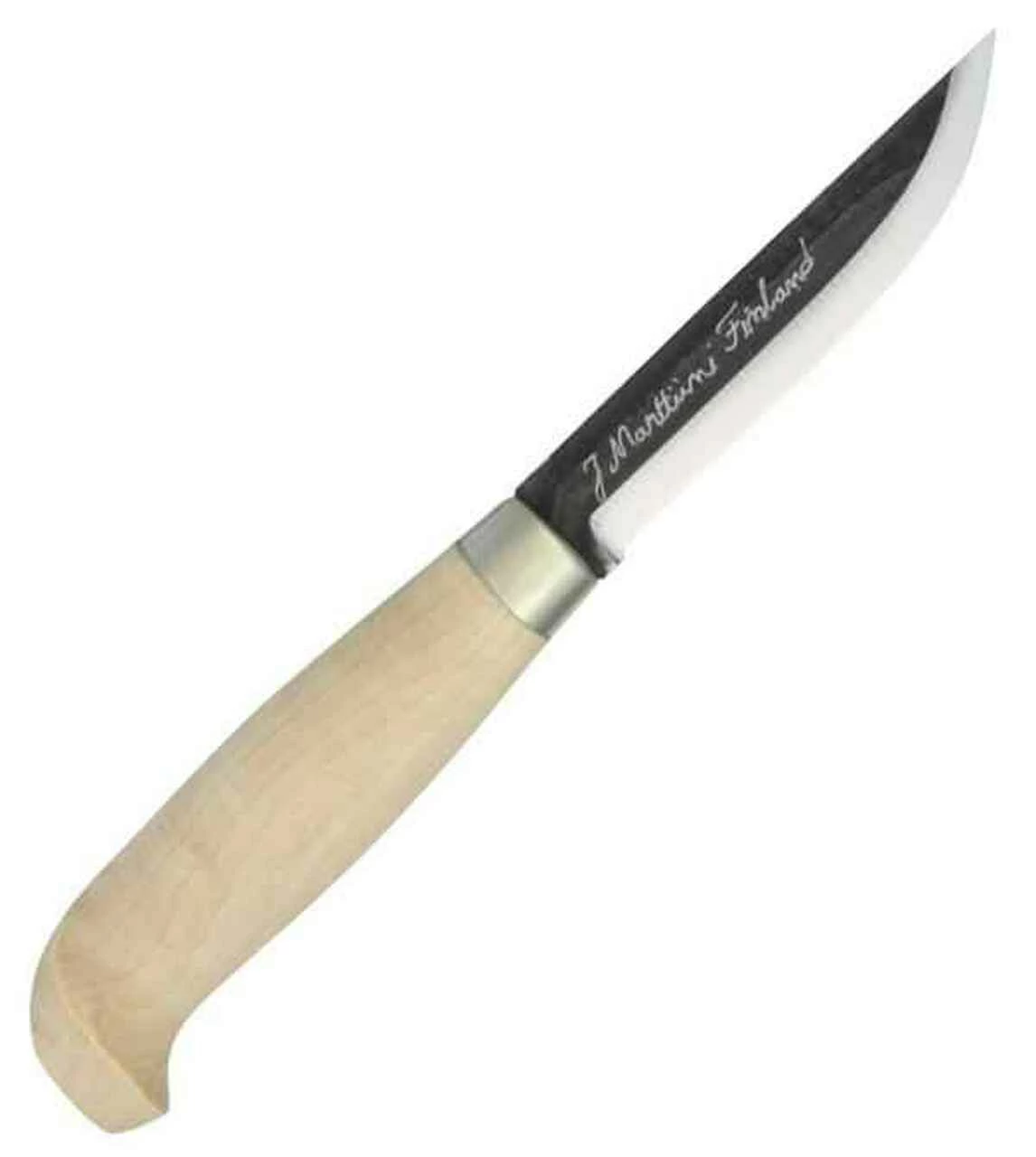 Marttiini Artic Circle. 7 3/4″ overall. 3 1/2″ carbon steel blade. Birch handle. Leather sheath.