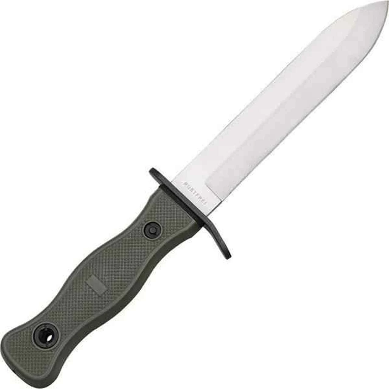Maserin German Army Knife, w/ Leather Sheath. 10 1/4″ overall. 5 3/4″ blade. Checkered OD green aluminum handle. OD green metal scabbard with leather belt loop.