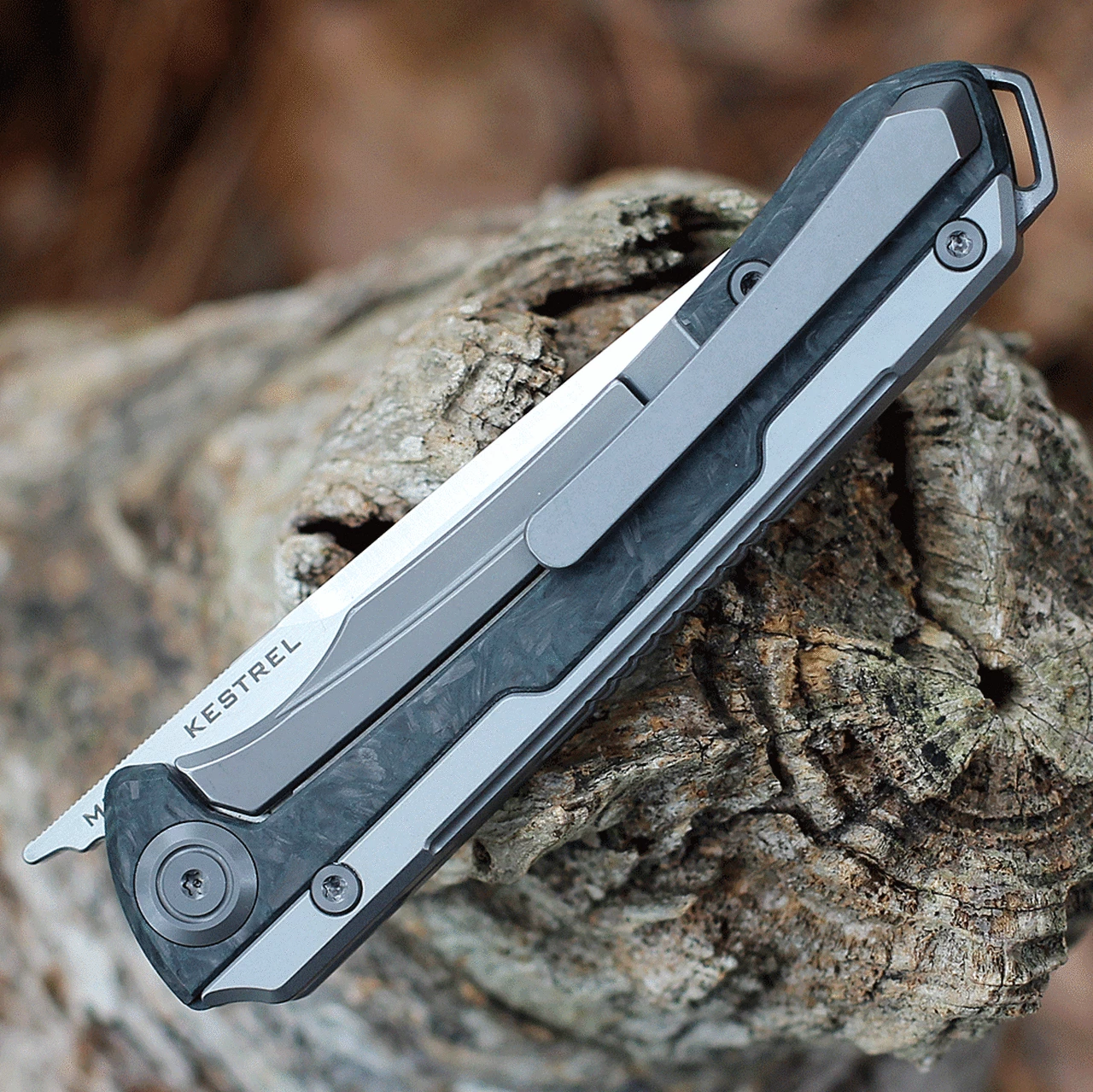The perfect everyday carry knife the Maxace KESTREL front flipper is a great size for your pocket or bag and sits comfortably in your hand with its smooth carbon fiber handle.