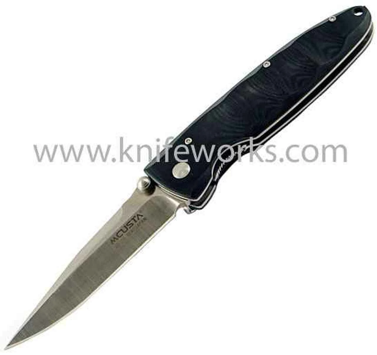 Mcusta Basic Folder Black Micarta. 4 1/4″ closed linerlock. VG-10 stainless blade (RC 59-60) with ambidextrous thumb studs. Contoured black micarta finger groove handles. Pocket clip. Features a specially designed Teflon washer system for silky smooth action. Hand finished.