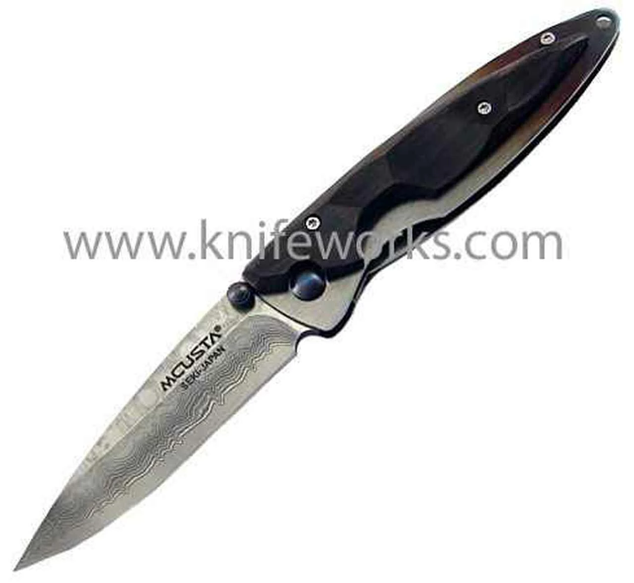 Mcusta Damascus Kasumi African Ebony handles.3 3/4″ closed linerlock.33 layer nickel damascus steel with a VG-10 core blade with ambidextrous thumb studs.Handles are all exotic wood with an anodized pivot pin.Each knife has a specially designed Teflon washer system for silky smooth action.All the knives comes with a decorative woven nishijin pouch.