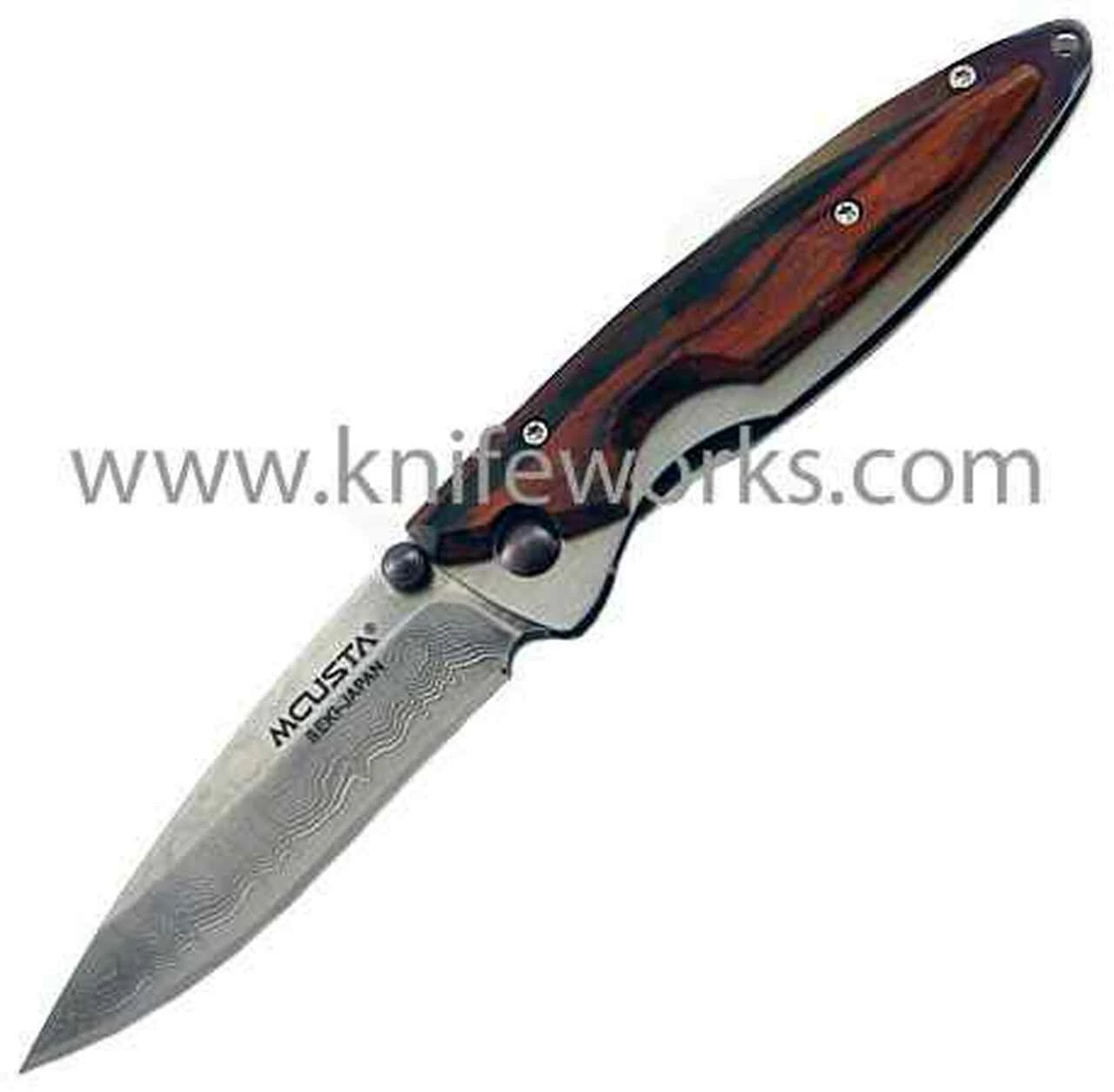 Mcusta Damascus Kasumi Cocobolo wood handles.3 3/4″ closed linerlock.33 layer nickel damascus steel with a VG-10 core blade with ambidextrous thumb studs.Handles are all exotic wood with an anodized pivot pin.Each knife has a specially designed Teflon washer system for silky smooth action.All the knives comes with a decorative woven nishijin pouch.