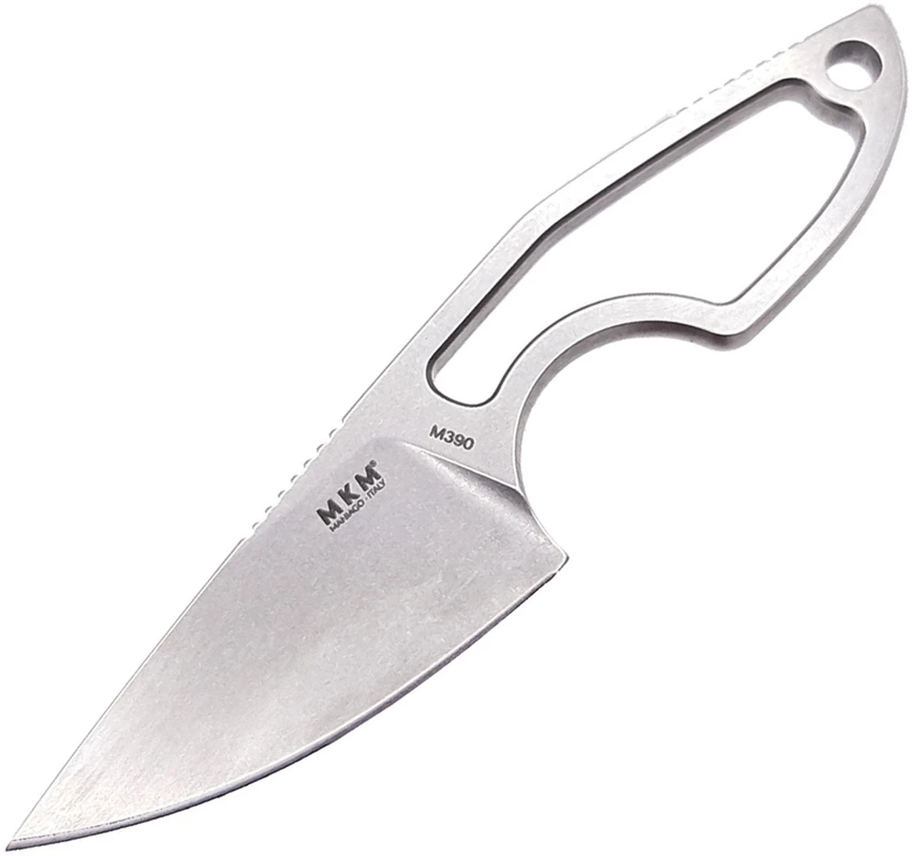 This MKM Mikro 1 fixed blade model was designed by legendary Danish knife maker Jesper Voxnaes, and is rocking a stonewashed Bohler M390 blade and a skeletonized, stainless steel handle. This compact blade comes with a leather sheath and neck band to be used as a neck knife.