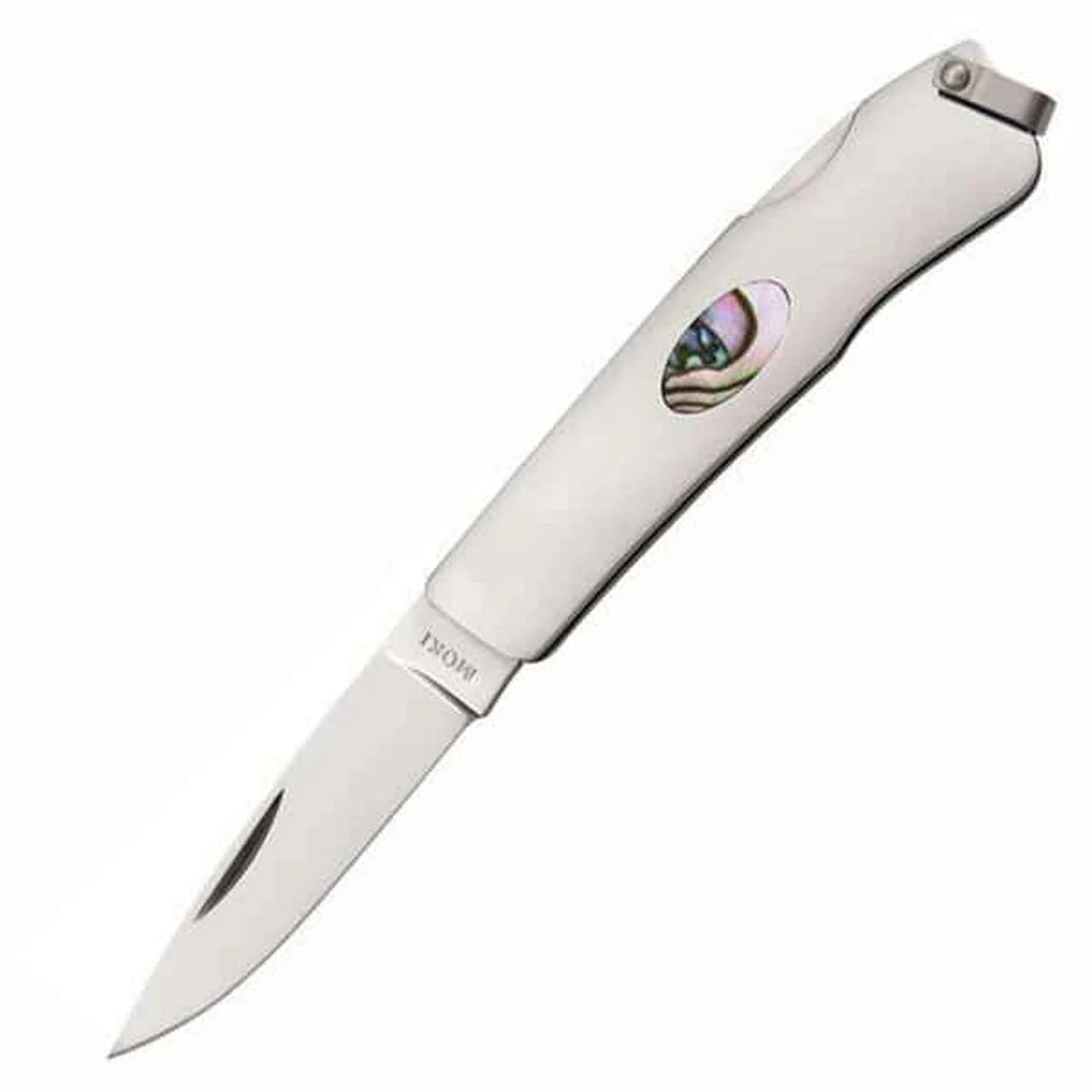 Moki Clione. 2 3/4″ closed lockback. Mirror polished AUS-8 stainless blade. SUS-410 stainless handles with abalone inlay and bail. Leather pouch.