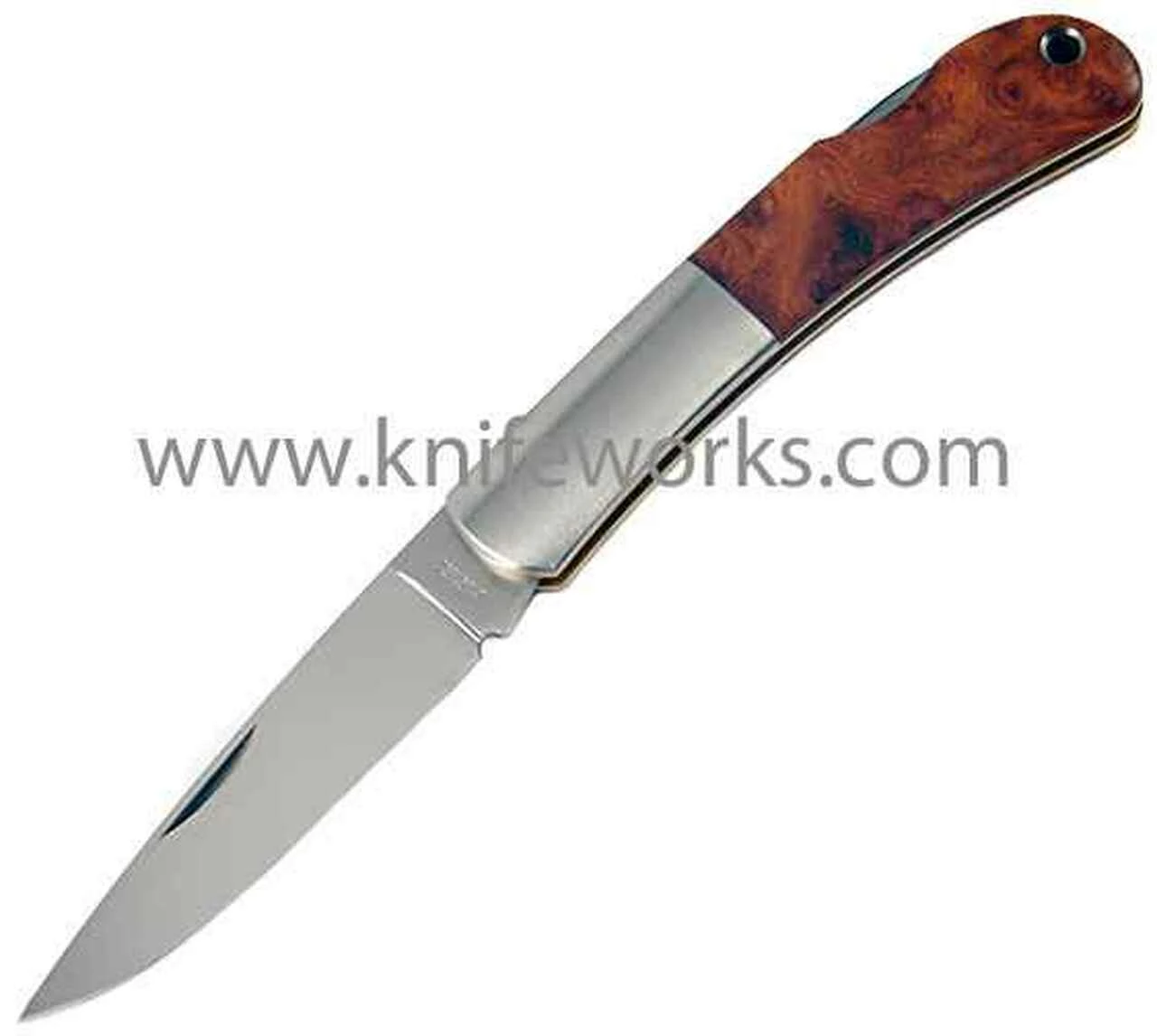 Moki Pliant. 4″ closed lockback. AUS-8 stainless mirror polished blade. Quince wood handles. Brushed stainless bolster. Lanyard hole. Nylon pouch.