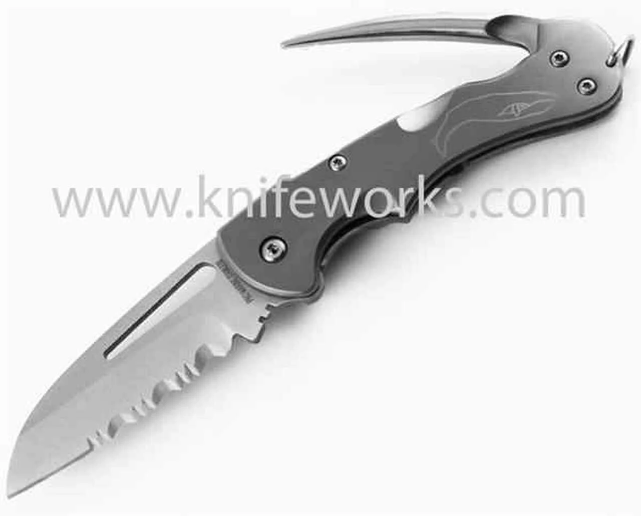 Myerchin Offshore Crew Part Serrated. 3 3/4″ closed. Partially serrated 440 stainless locking sheepsfoot style blade and marlin spike. Shackle acts as lock-release mechanism. Stainless handles. Black nylon belt sheath.
