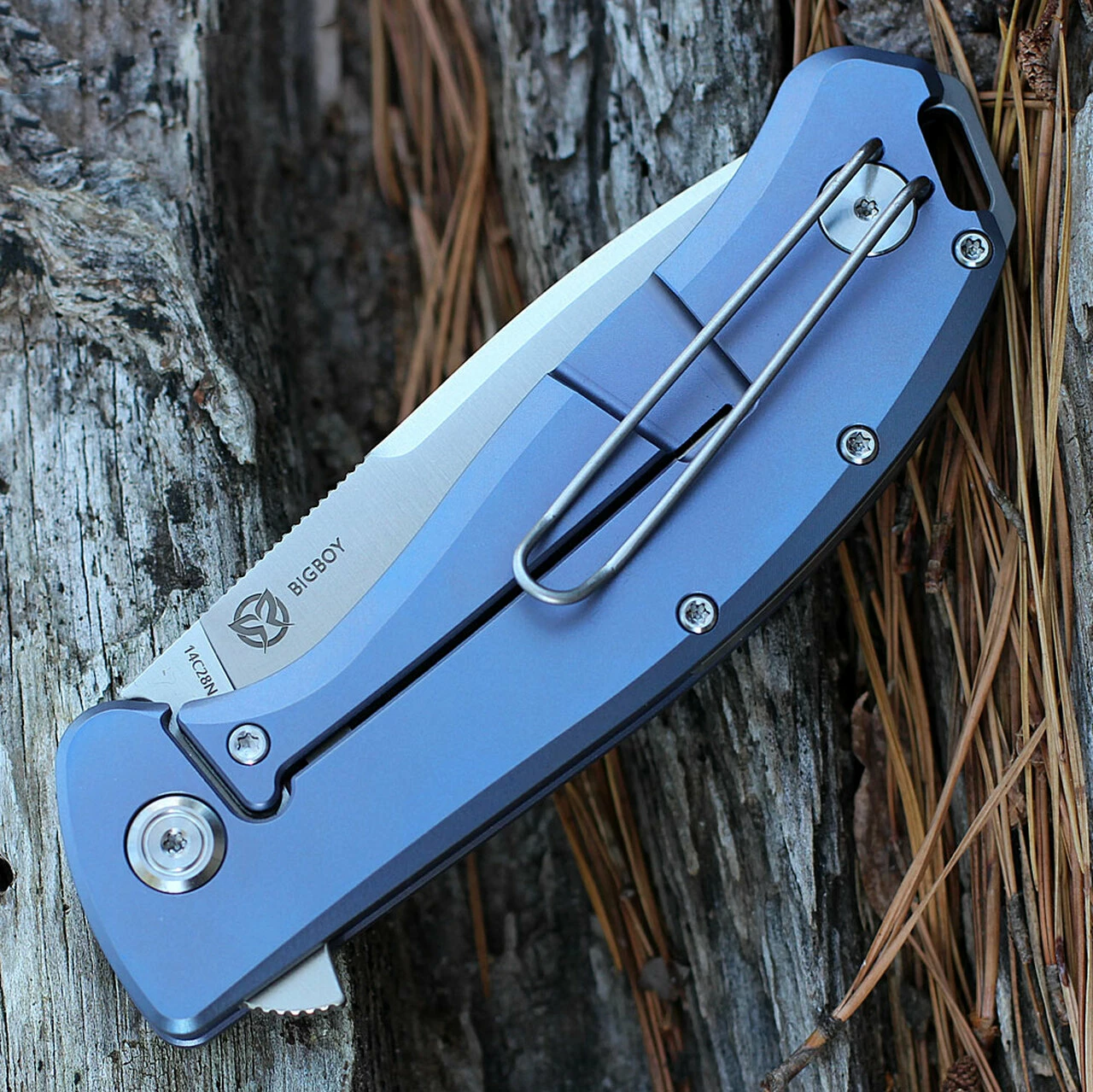 PMP Knives Big Boy Flipper – 3.65″ 14C28N Satin Drop Point Blade, Blue Titanium Handle