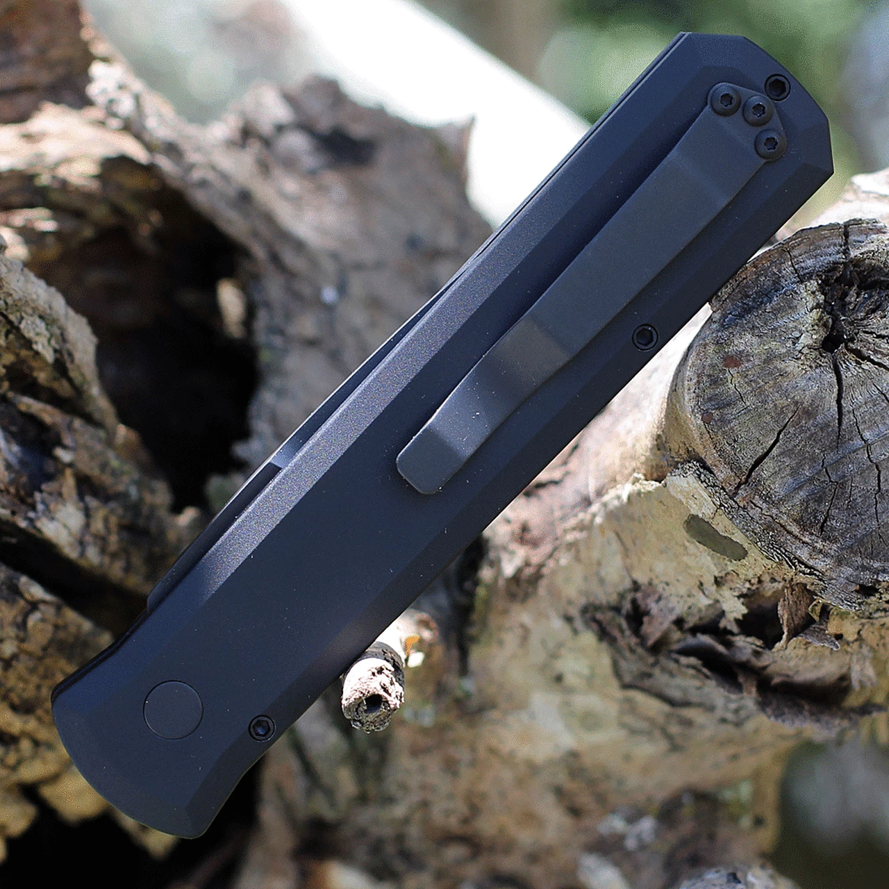 The Godfather SWAT automatic knife by Pro-Tech features a fully blacked out design with lightweight black anodized aluminum handles, black DLC coated stiletto blade, matching DLC coated hardware and the superior auto action by Pro-Tech Knives.