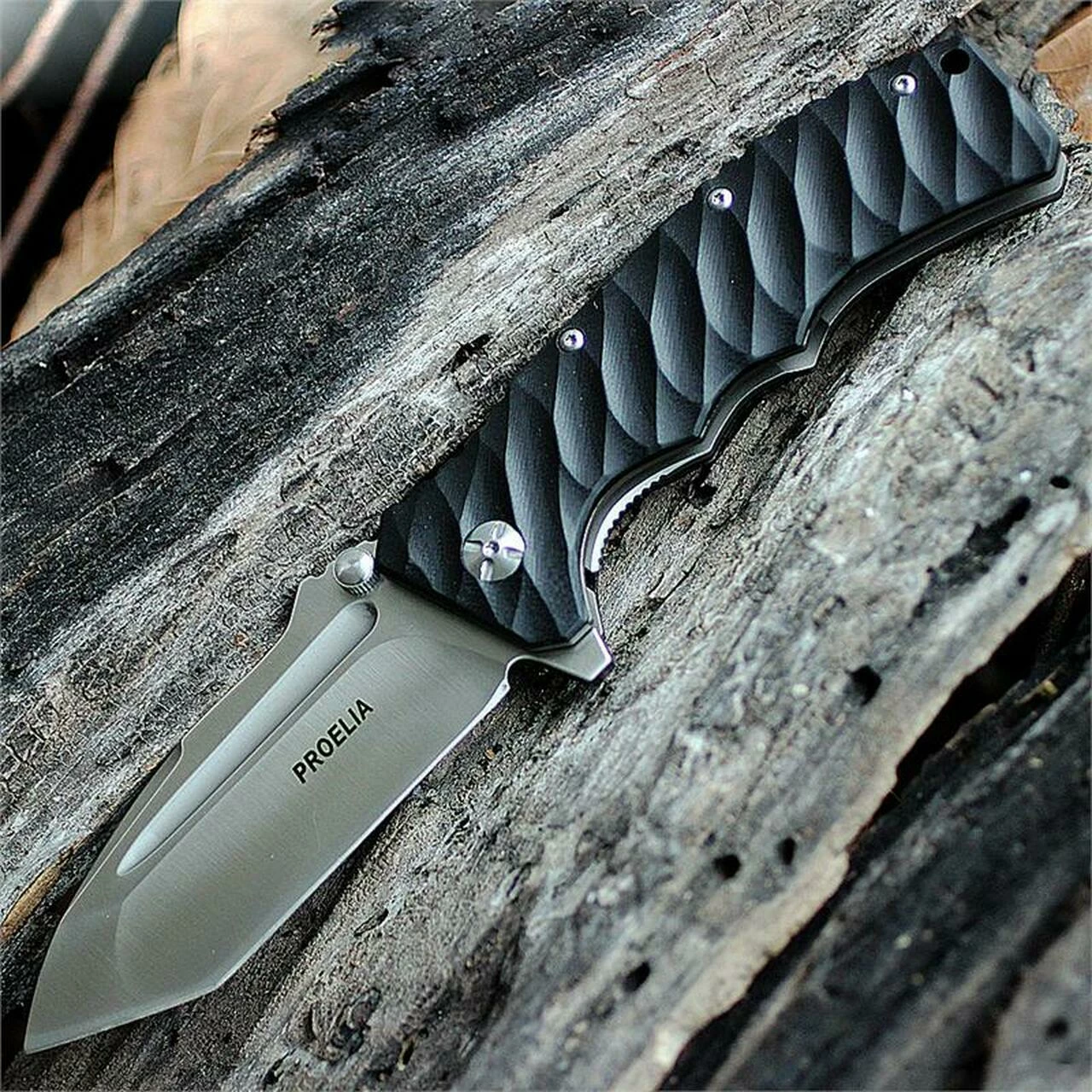 Proelia Knives Tactical Folder 4″ Satin D2 Tanto Blade, Black G10 Handles